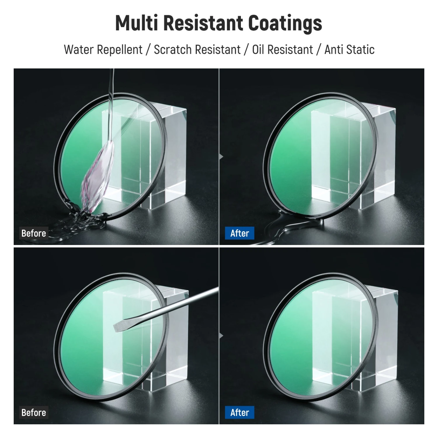 - Multiple Nano Coatings– Multiple nano coatings on both sides are water repellent, scratch resistant, and oleophobic, effectively reducing the reflection came from the filter itself and the ground