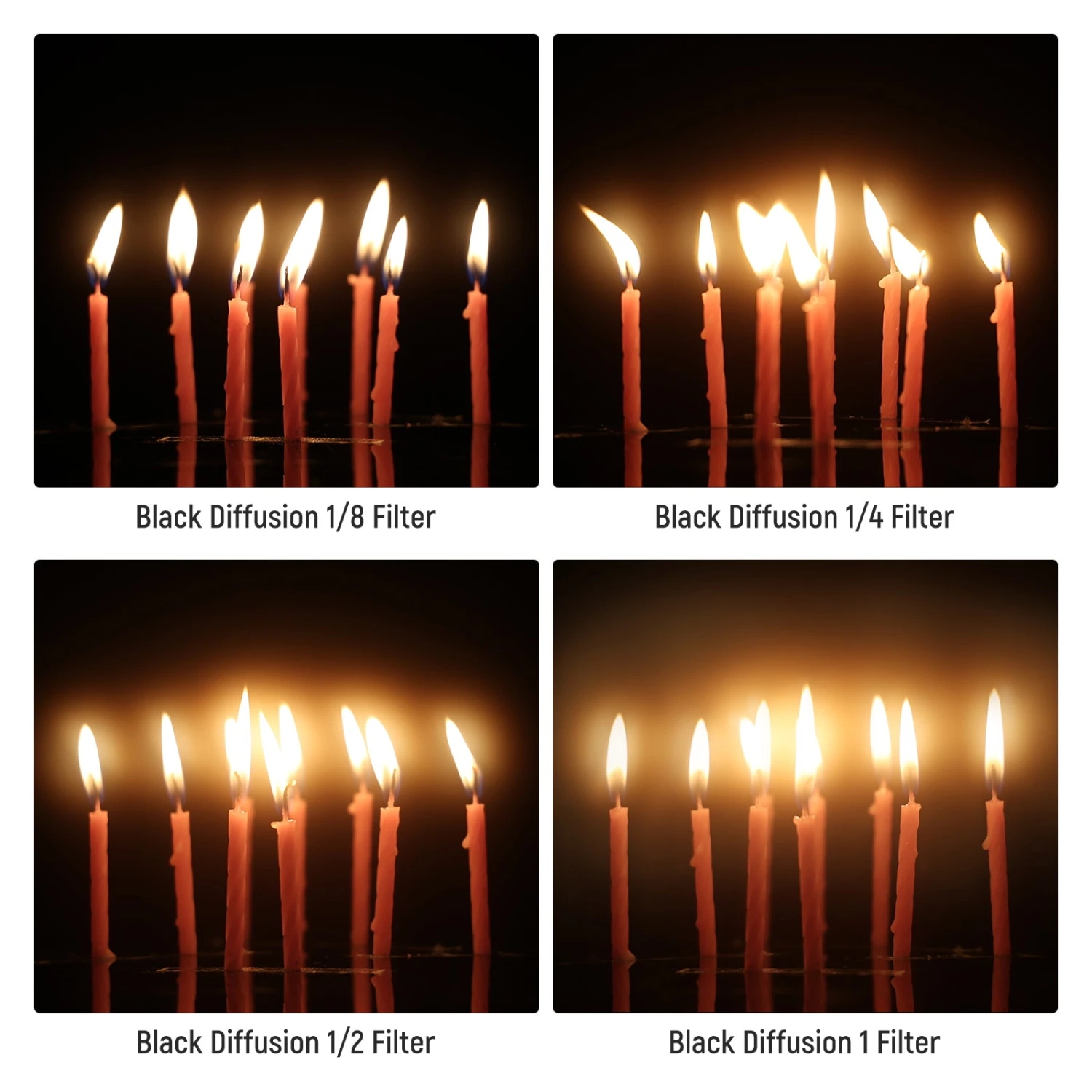 - Black Diffusion Camera Lens Filter– NEEWER black diffusion 1/4 filter with dreamy cinematic effects helps reduce highlights and lower the glare, making the skin look smoother and softer, ideal for portrait photography, video recording, and vlog videos