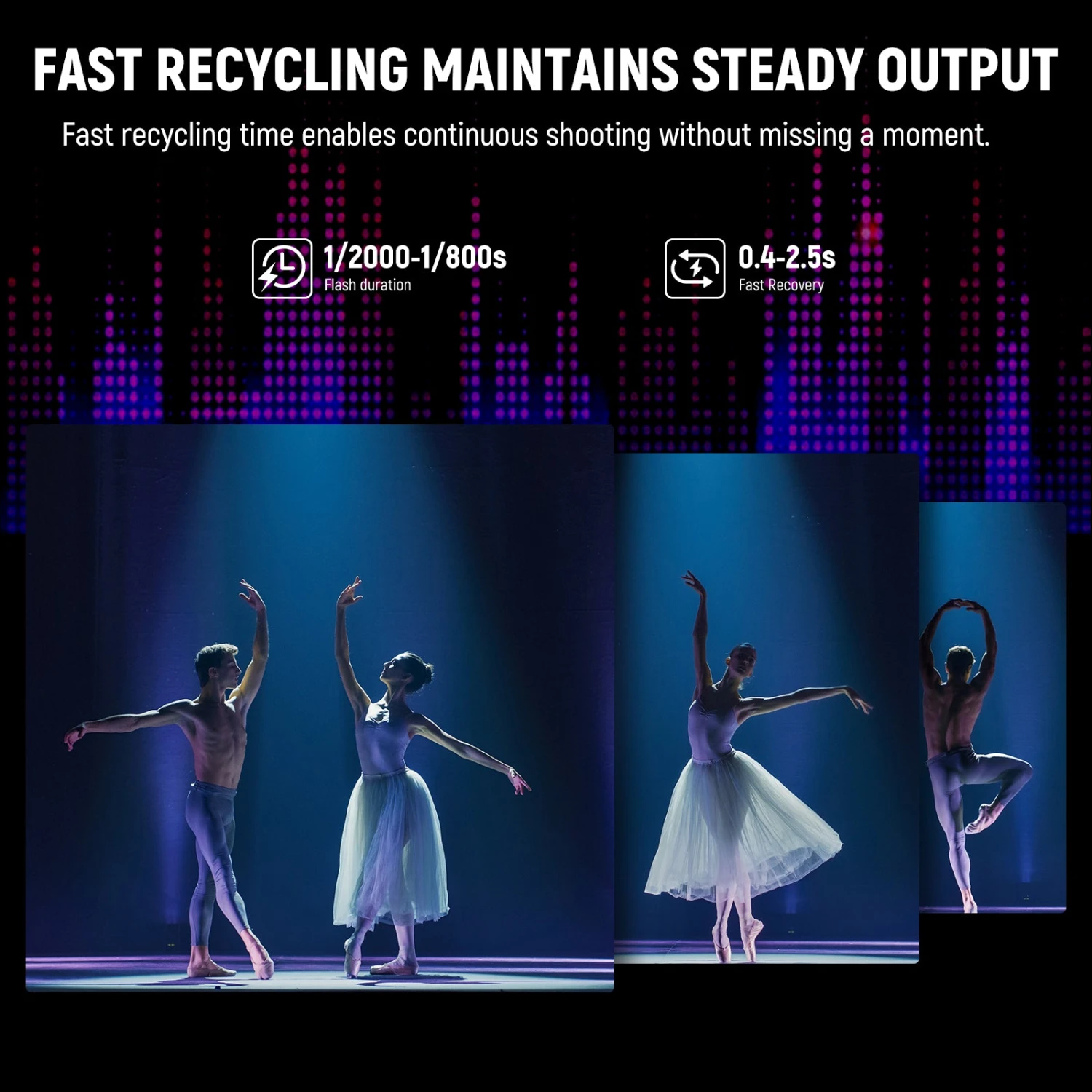 - Excellent 150W Modeling Lamp– Compact yet capable, the 150W modeling lamp has 9 brightness levels (L1–L9) and 7.0–10 (1/8–1/1) flash power adjustment to match actual ambient light conditions. 1/2000–1/800s flash duration and 0.4-2.5s recycling time help you capture every precious moment. The flash tube with a stable power output resists high heat, high voltage, deformation, and breakage. Memory function saves settings for use the next time