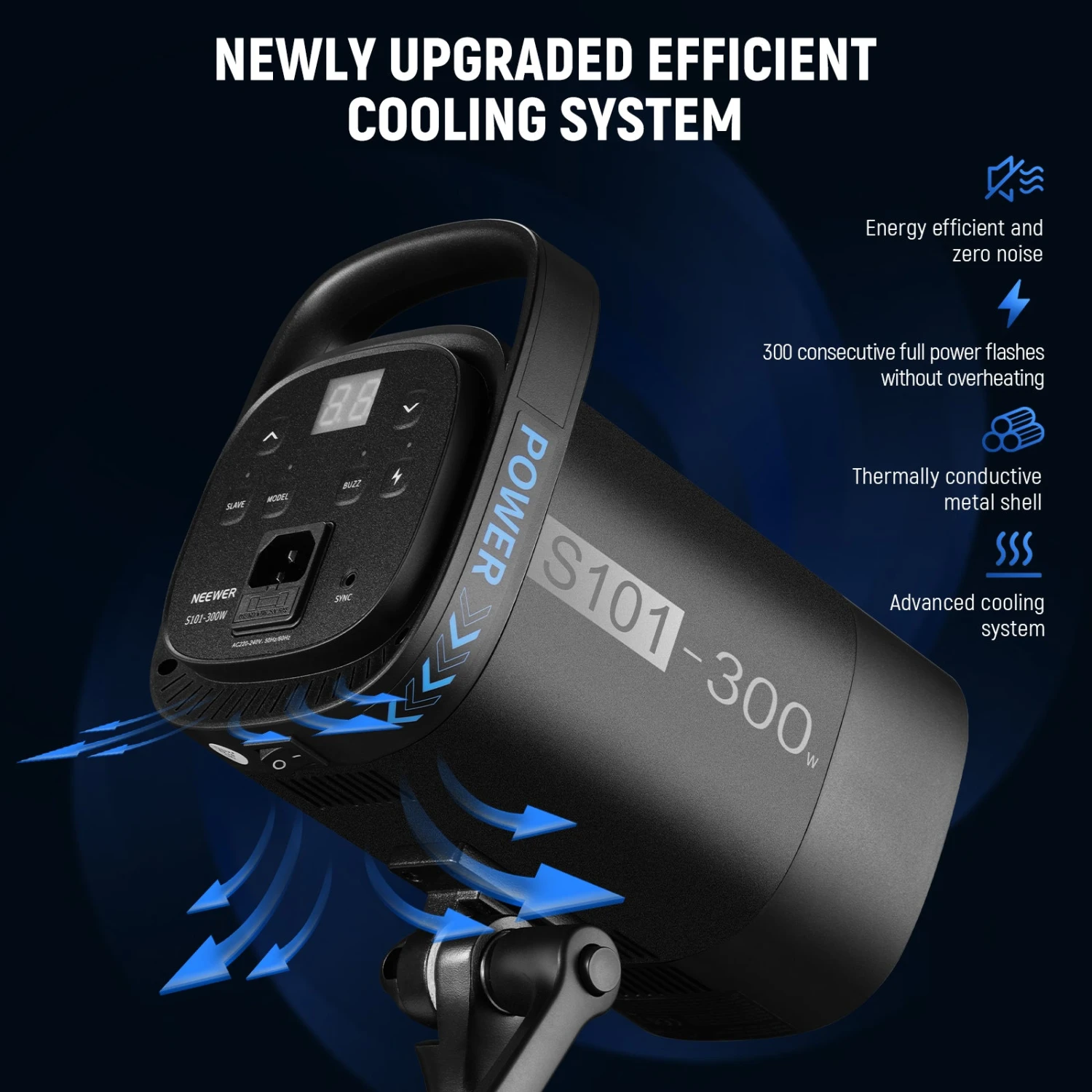 - Efficient Heat Dissipation System– The consistent, efficient, and silent heat dissipation system adopts optimized vents and cooling fans and an enlarged air inlet area for higher fan speed and lower temperature. No overheating will occur even after 300 consecutive full power flashes—for safe use and an extended flash lifespan