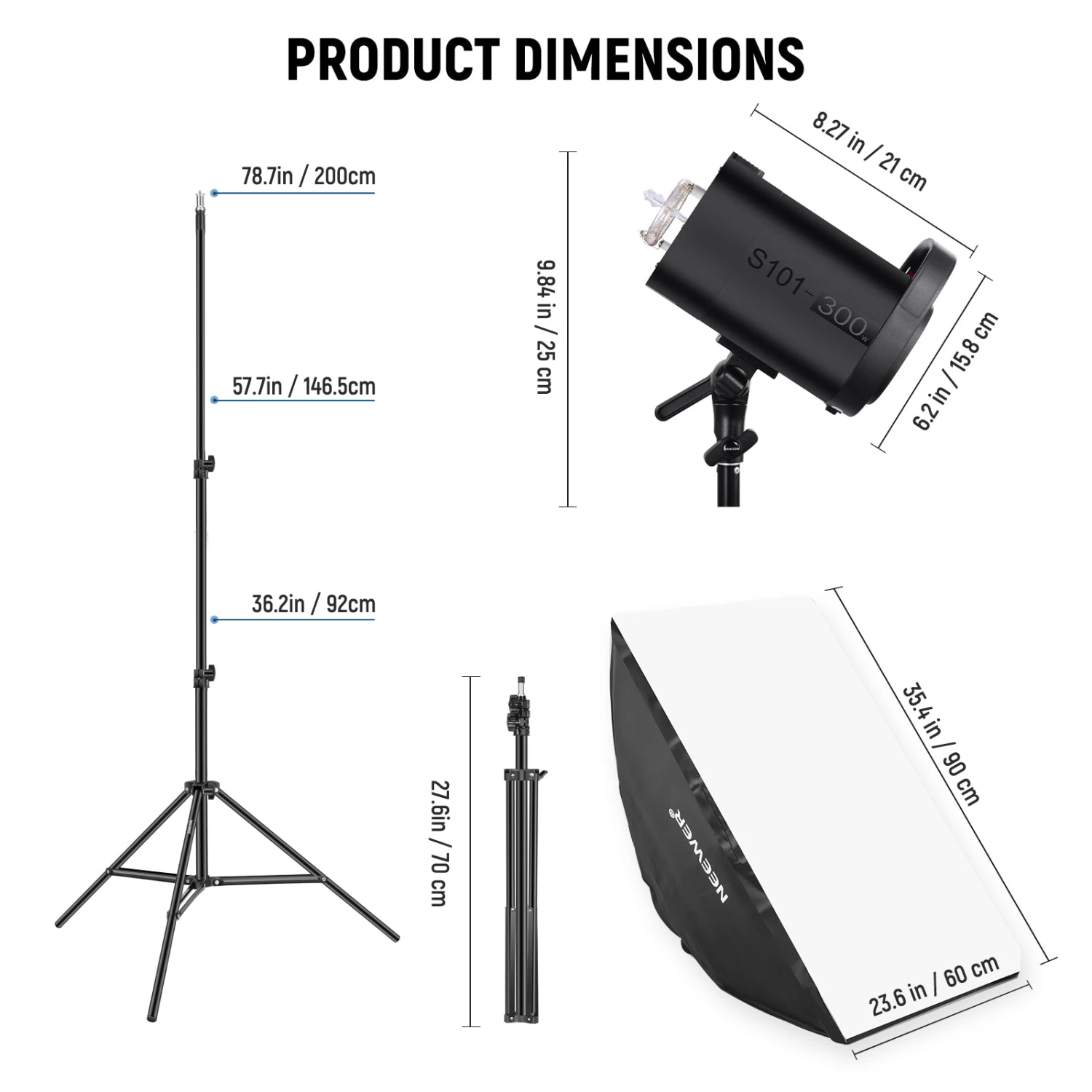 - Powerful Studio Monolight Kit– This studio speedlight kit includes two S101-300W monolight flashes, two 6.6ft light stands, two softboxes, an RT-16 transmitter, two receivers, a 5 in 1 reflector, and a big carrying bag that can store and transport the whole kit. Each monolight features 300Ws maximum power and 5600K color temperature—an ideal light source for product, portrait, still life, food, commercial, and wedding photography
