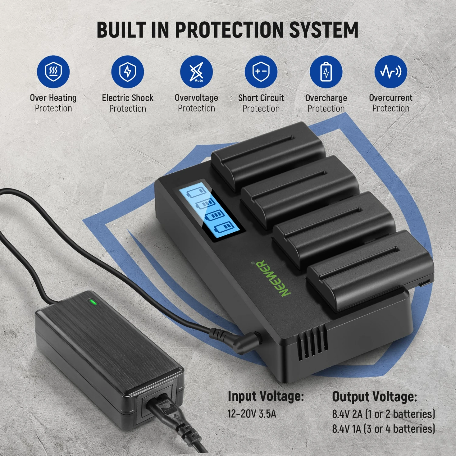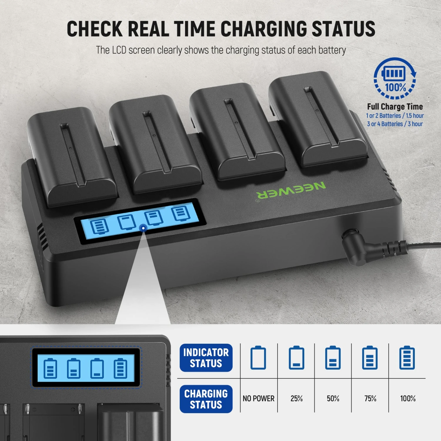 - Wide Compatibility– NP-F550 batteries power any device with an NP-F battery plate, including camcorders and video cameras, Neewer field monitors, ring lights, and LED video lights. The charger fits NP-F550, 570, 750, 770, 960, 970, 975, and other NP-F batteries