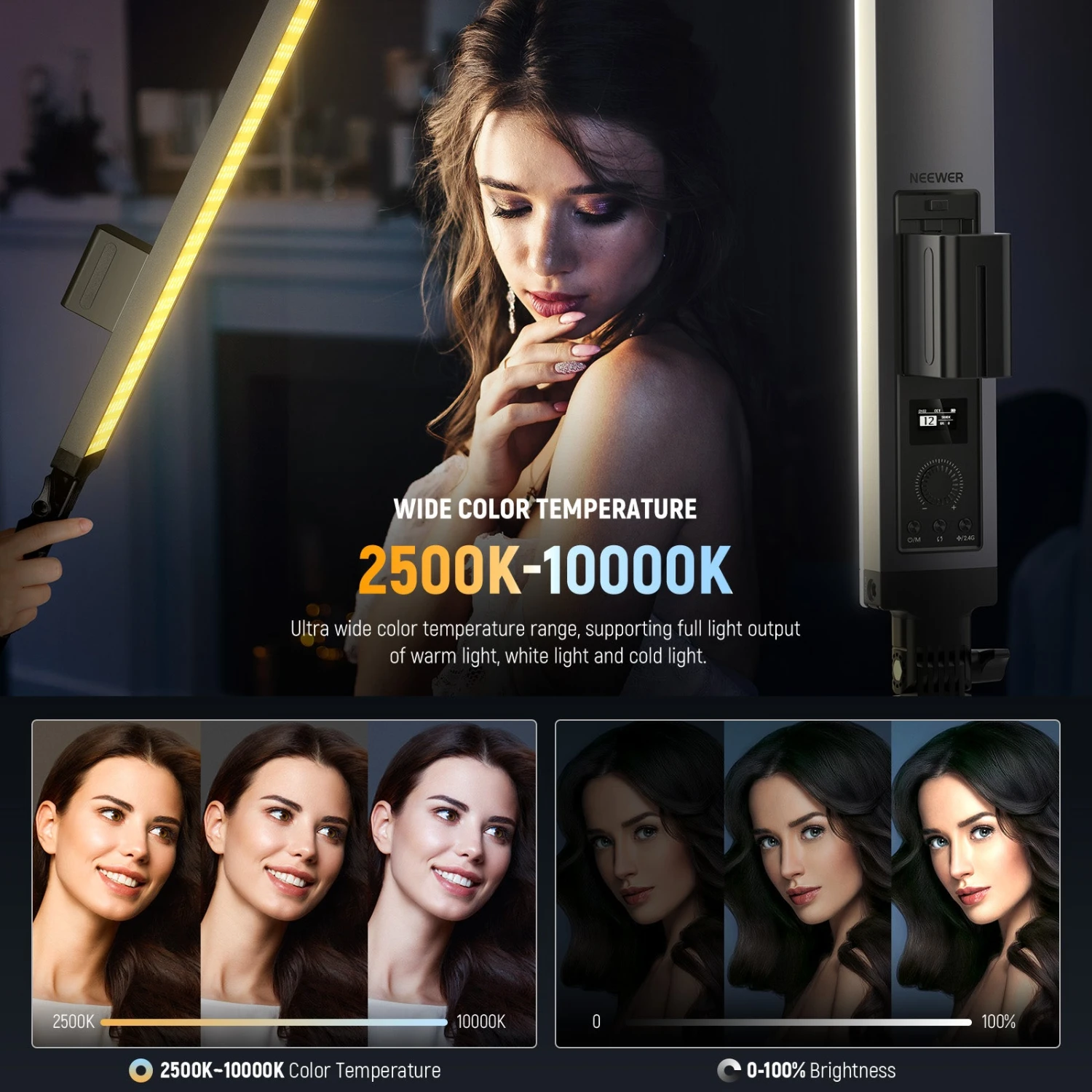 - APP/2.4G/Panel Control– Directly adjust the color temperature, brightness, GM value, etc, via the control panel; or download NEEWER APP and connect it to the light wands via Bluetooth to manage more functions; to explore more, switch to the 2.4G mode for multi light control via the built in 2.4G signal module. In this mode, multiple lights are set to the same channel like CH88, when adjusting one of them, the others will change synchronously, which will improve your shooting efficiency