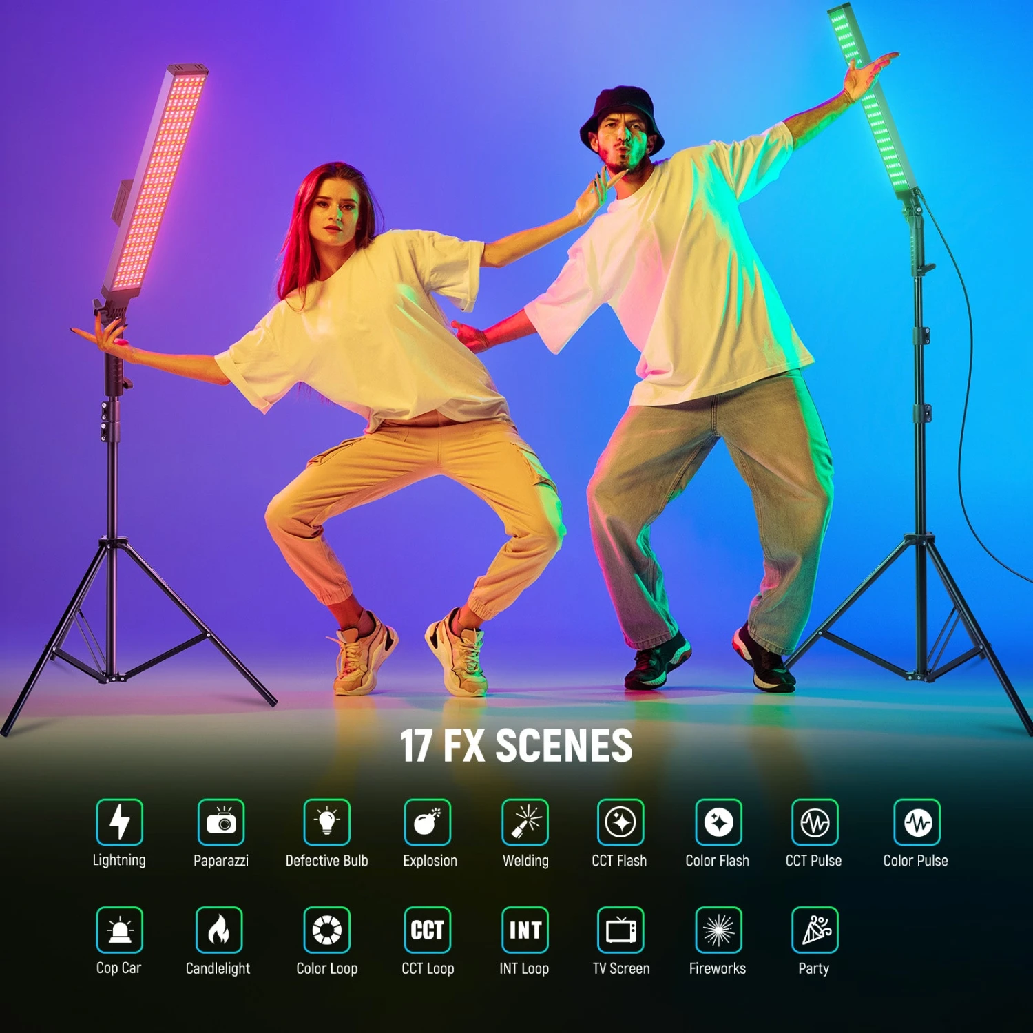 - Pro Studio Lighting Kit– Includes 2 RGB tube lights, 2 light stands, 2 diffusers, 2 power cords, and 2 power adapters. The 21W light sticks are integrated with 360 premium LEDs, delivering a max illuminance of 3250lux at 0.5m (5600K). They offer an extensive color temperature range from 2500K to 10000K with an adjustable brightness of 0-100%, creating the perfect ambiance for any setting. The white diffusers soften the light and reduce shadows to enhance your photography results