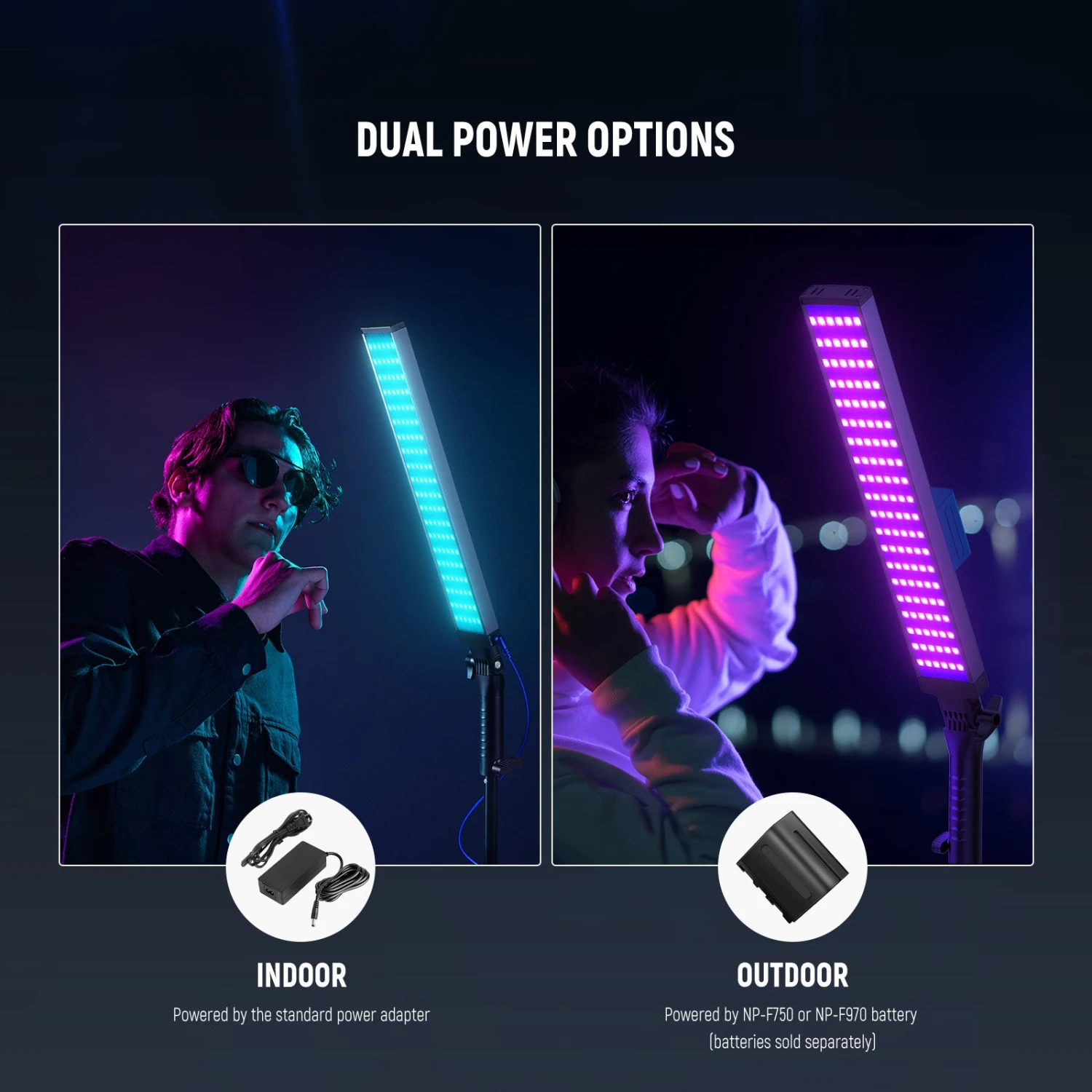 - Dual Power Options via Adapter/NP-F Battery– The included power adapters and cables provide a reliable solution for extended indoor shooting by connecting to power sockets. For outdoor shoots, you can power these LED tube lights with NP-F750 or NP-F970 batteries (sold separately), bringing greater flexibility and eliminating the hassle of cables