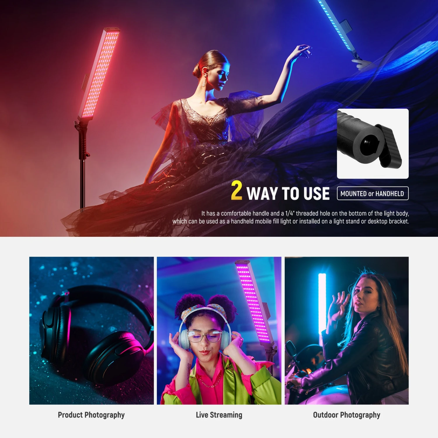 - Light Stand Mounted & Handheld Use– Our LED video light sticks feature a comfortable handle of 5.1″/13cm long, 180° tiltable, nonslip, and easy to grasp for handy lighting, compatible with iPhone Android phone selfies or camera shooting. On top of that, each light wand is kitted with a light tripod stand adjustable in height from 32.5-76.6″/82.5-194.5cm. These lighting accessories can be quickly attached to light stands, desktop stands, or boom arms via the 1/4″ threads at the bottom