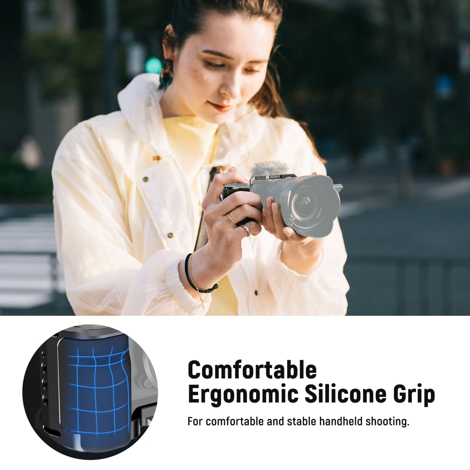 - Comfortable Ergonomic Silicone Grip– Designed for ergonomic handheld shooting, the nonslip silicone grip allows you to firmly hold the caged camera while ensuring a secure and comfortable grip