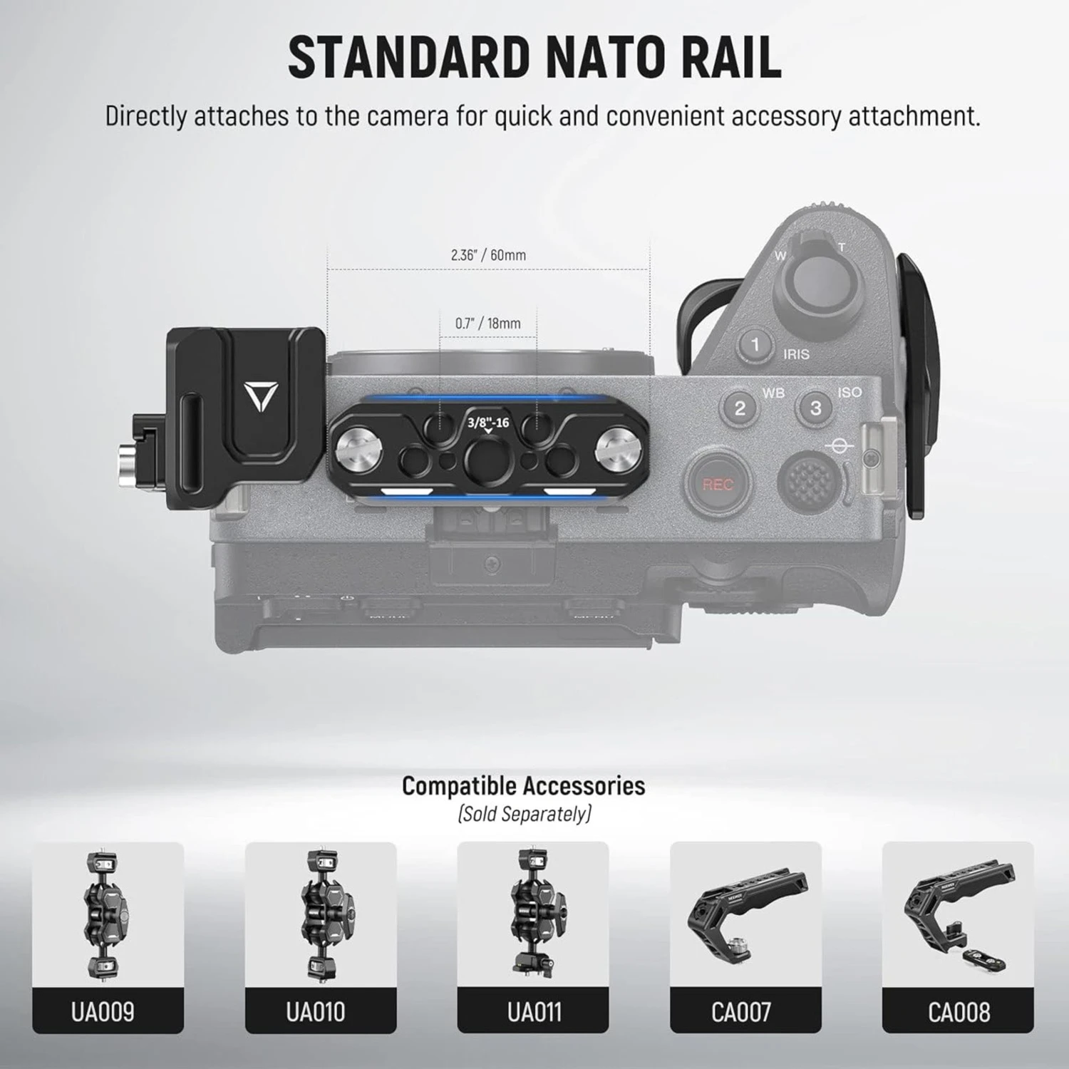 - NATO Rail for Fast Connection– Mounted on top of the FX3/FX30 camera via two 1/4″ screws, the NATO rail with quick release lets you instantly yet safely install compatible accessories, such as top handles, clamps, monitor mounts, and magic arms to the camera. Note: The spacing between two 1/4″ holes is 27mm, so it is not for accessories with an 18mm hole spacing