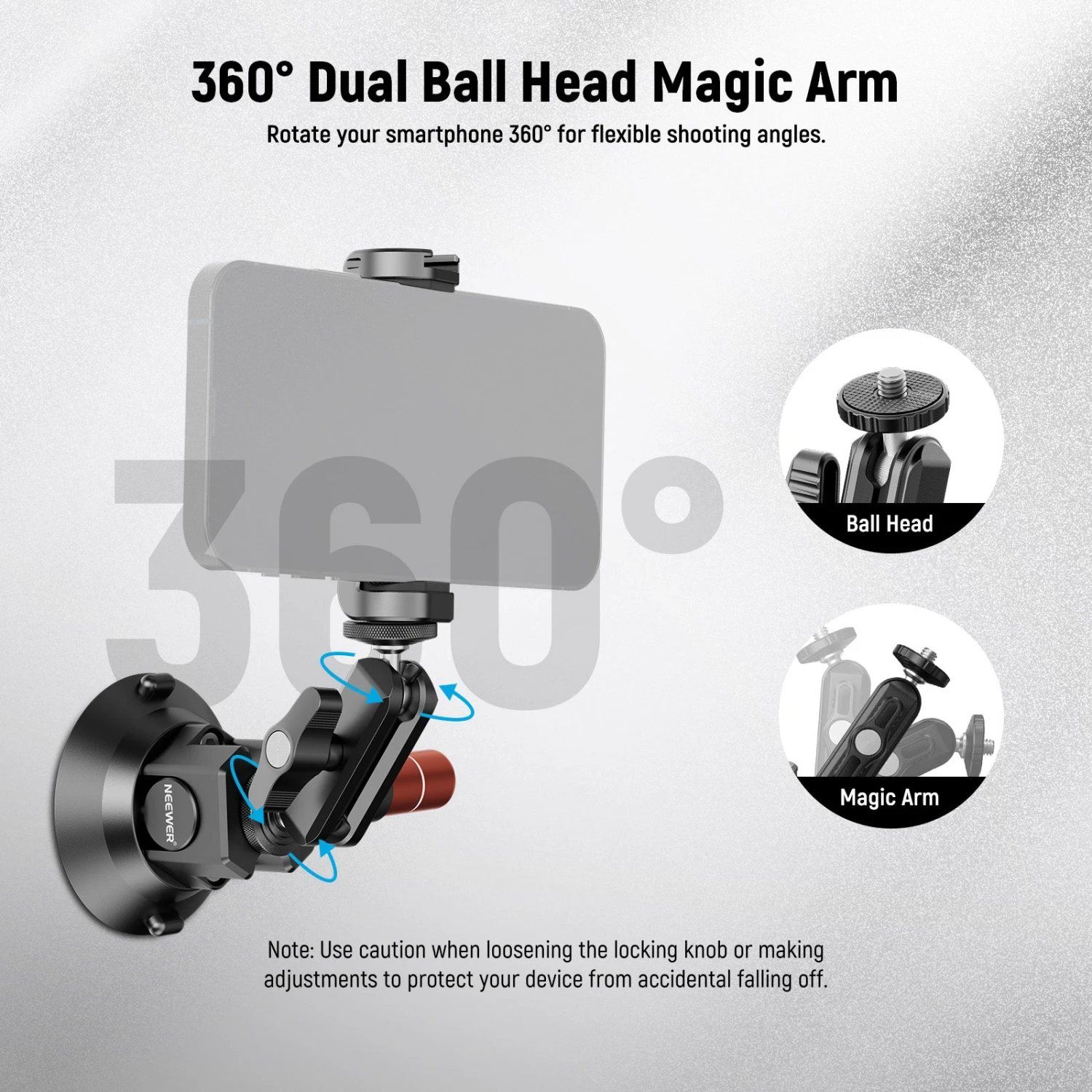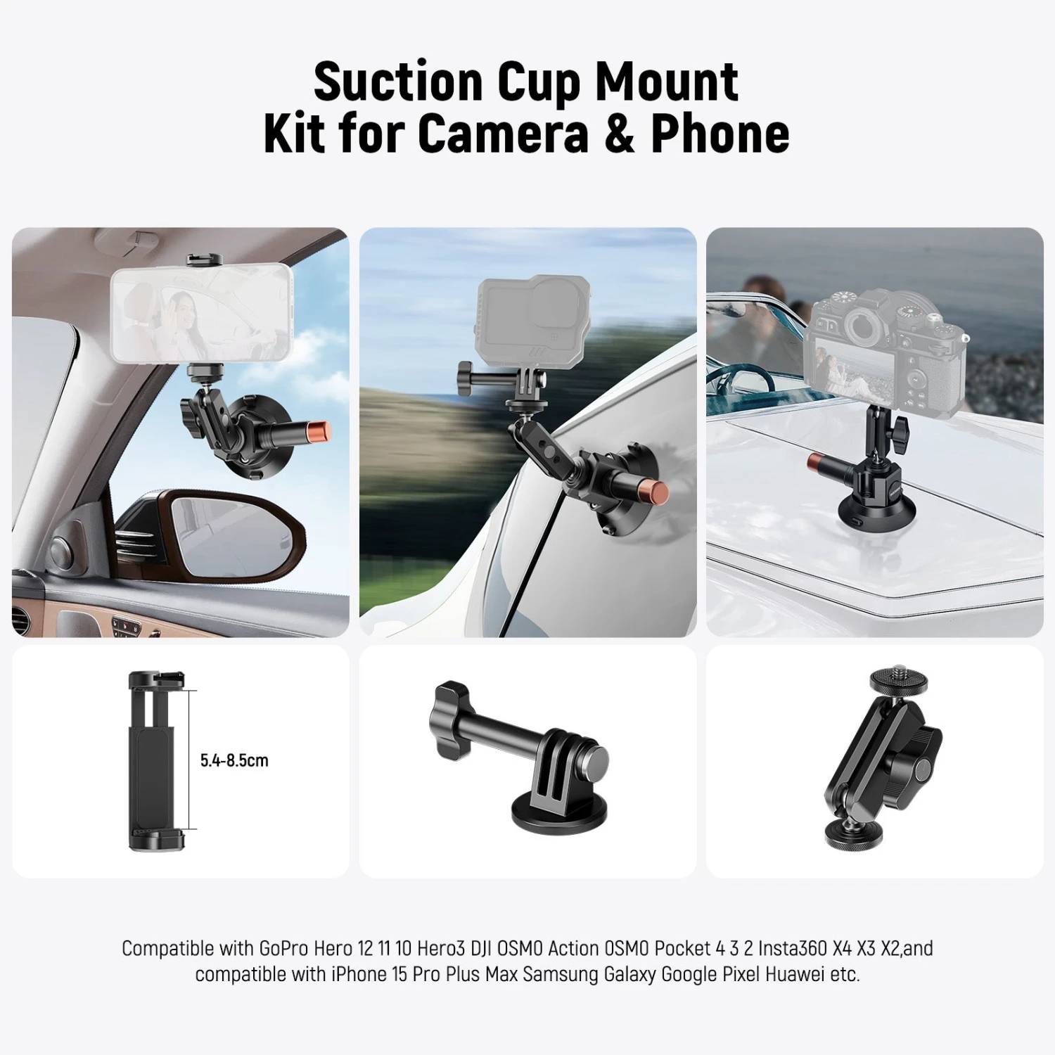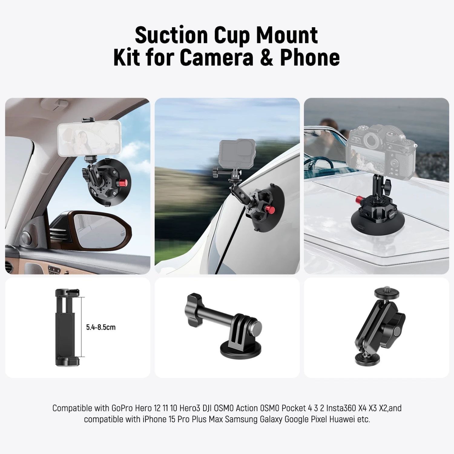 - Suction Cup Mount Kit– This 3″ pump activated vacuum suction cup firmly sticks to most surfaces, and rotates your action camera (adapter included) or smartphone (phone holder included) at 360° using the dual ball head magic arm, compatible with Hero 13 12 11 10 9 8 7 Black go pro max DJI OSMO Action 5 Pro 4 3 2 Insta360 X4 X3 X2 insta 360 go 3 ace pro, compatible with iPhone 16 15 Pro Plus Max Samsung Galaxy Google Pixel, etc. Note to use at speeds below 80 km/h to prevent accidental drops