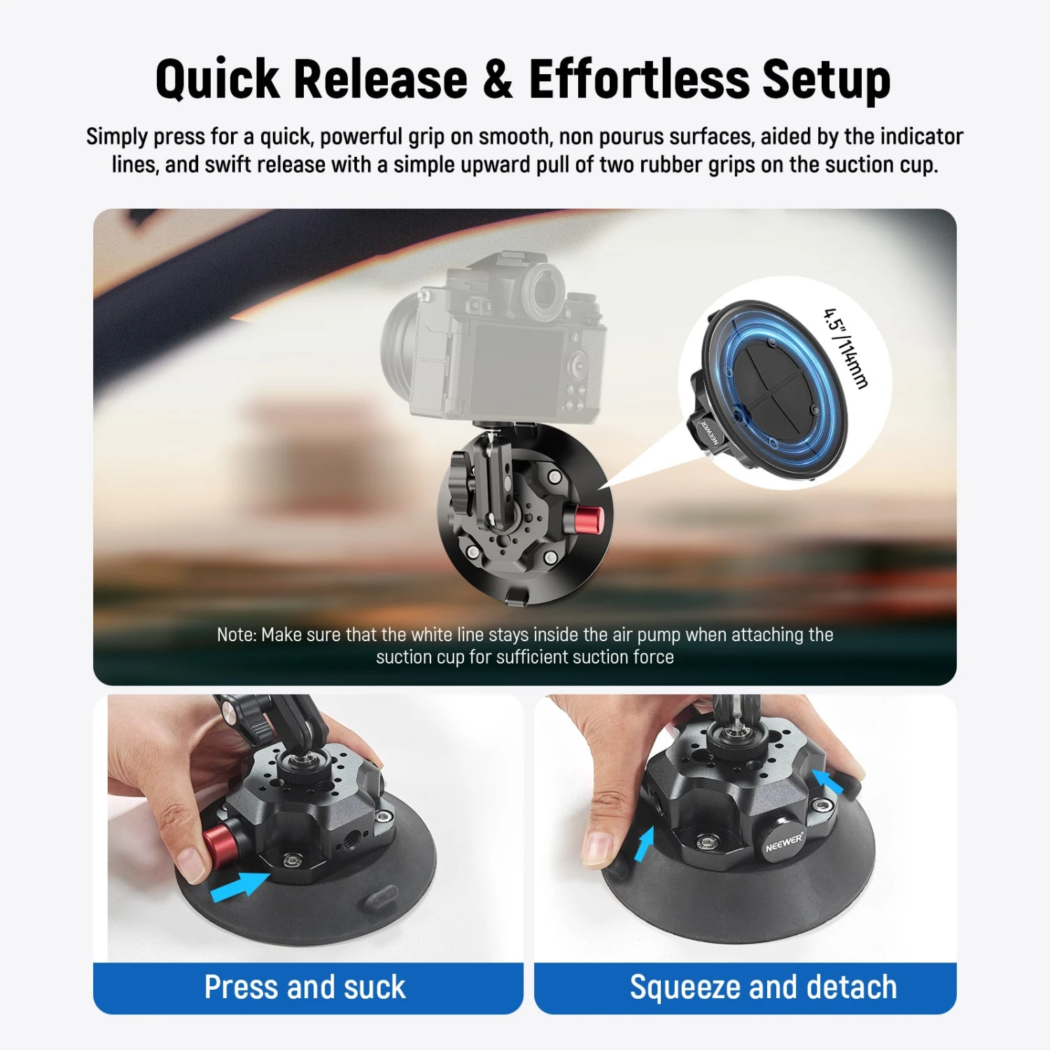 - Quick Release & Effortless Setup– Simply press for quick, powerful grips on the surfaces, aided by the indicator lines, and swift release with a simple upward pull of two rubber grips on the suction cup. Note: Make sure that the white line stays inside the air pump when attaching the suction cup for sufficient suction force