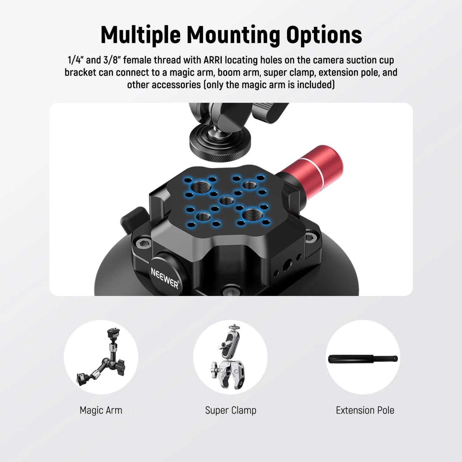 - Multiple Mounting Options– A 1/4″ female thread with ARRI locating holes on the camera suction cup bracket can connect to a magic arm, boom arm, super clamp, extension pole, and other accessories (only the magic arm is included), compatible with Ulanzi compatible with Smallrig accessories. The top 1/4″ screws on the articulating magic arm are for mirrorless vlog cameras, camcorders, action camera adapters, phone holders, and more (the action camera adapter and phone holder are included)