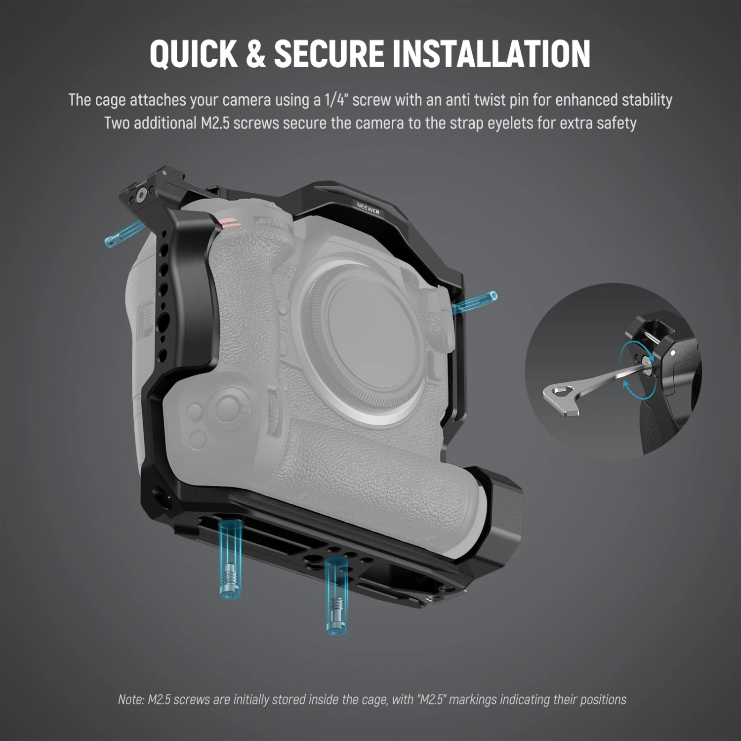 - Quick & Secure Installation– The cage attaches your camera using a 1/4″ screw with an anti twist pin for enhanced stability. Two additional M2.5 screws secure the camera to the strap eyelets for extra safety. Note: M2.5 screws are initially stored inside the cage, with “M2.5” markings indicating their positions