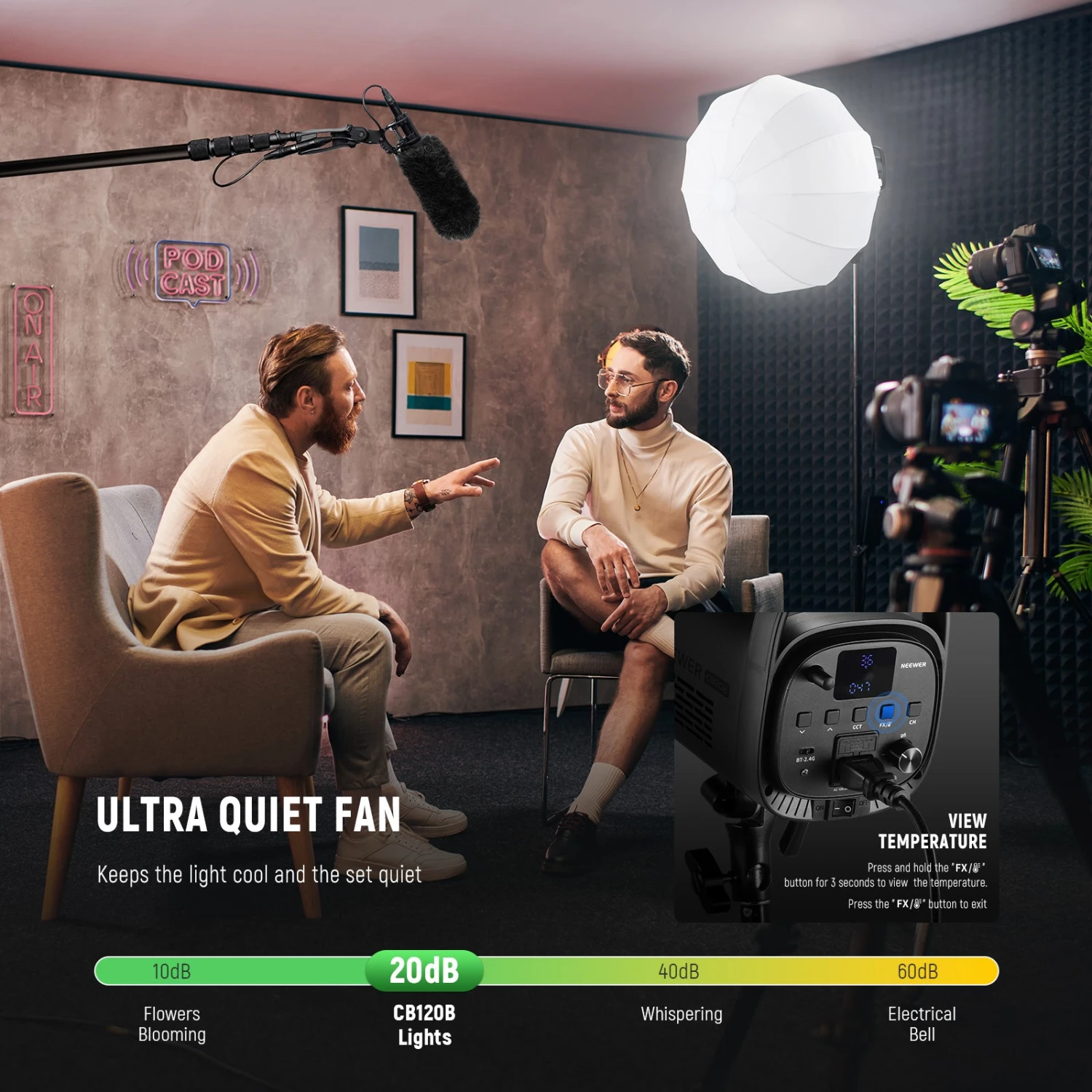 - Physical/App/2.4G Control Modes– The light body features an LCD panel and function summarys for easy and precise adjustment. Use NEEWER APP to wirelessly manipulate CB120B or simultaneously control up to 256 lights within 49’/15m. In 2.4G mode, set CB120B and other NEEWER lights in the same channel (00-99), then use any of them as a remote for lighting sync within 66’/20m