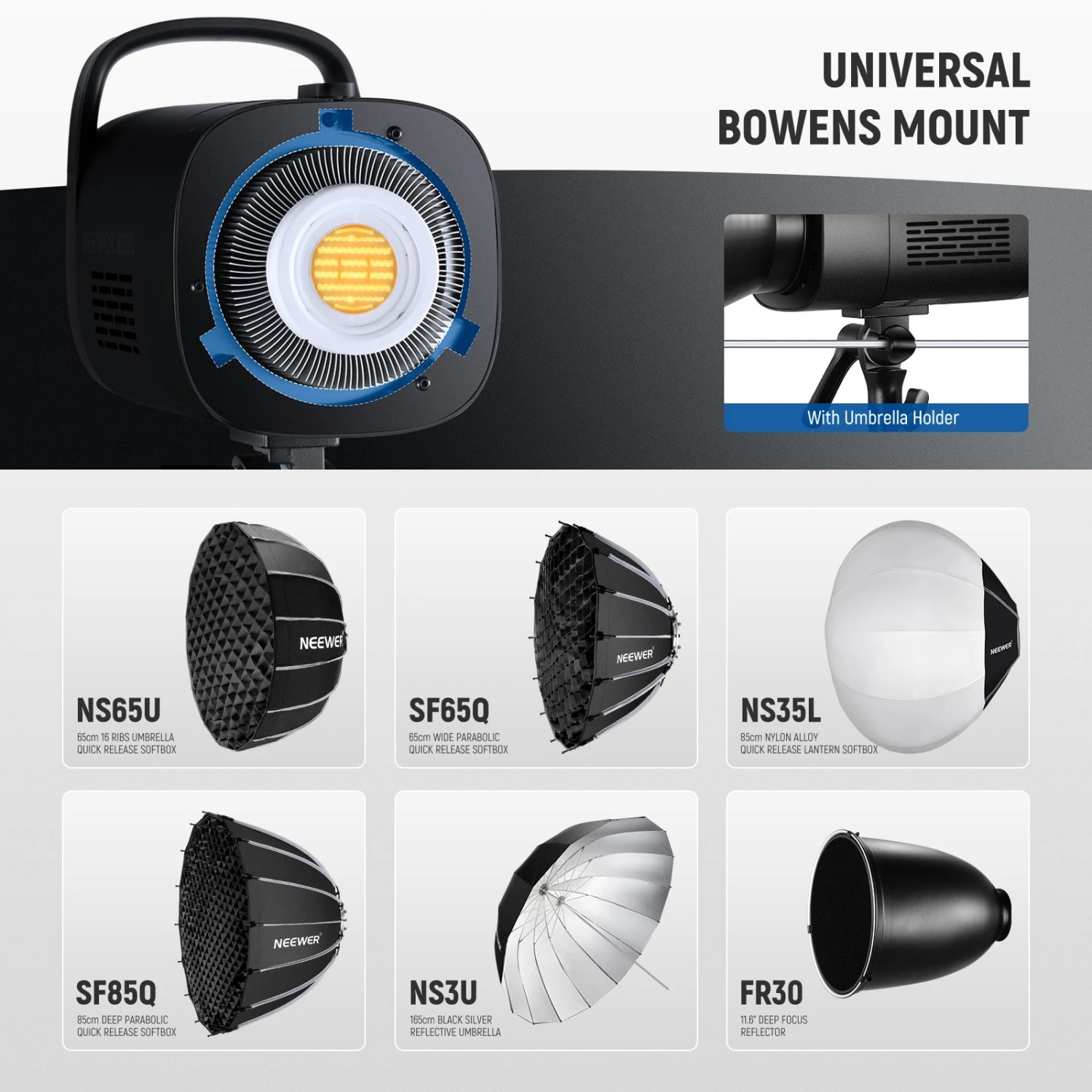 - Bowens Mount & AC Power Supply– Bowens mount connects various light modifiers, and the standard reflector with interior scale patterns ensures diffused output and enhanced illuminance. A diffuser is included to soften the light source. The stand mount adapter can tilt by 180° for flexible angles and features an umbrella holder for most photography umbrellas. Note: This light only supports AC power supply