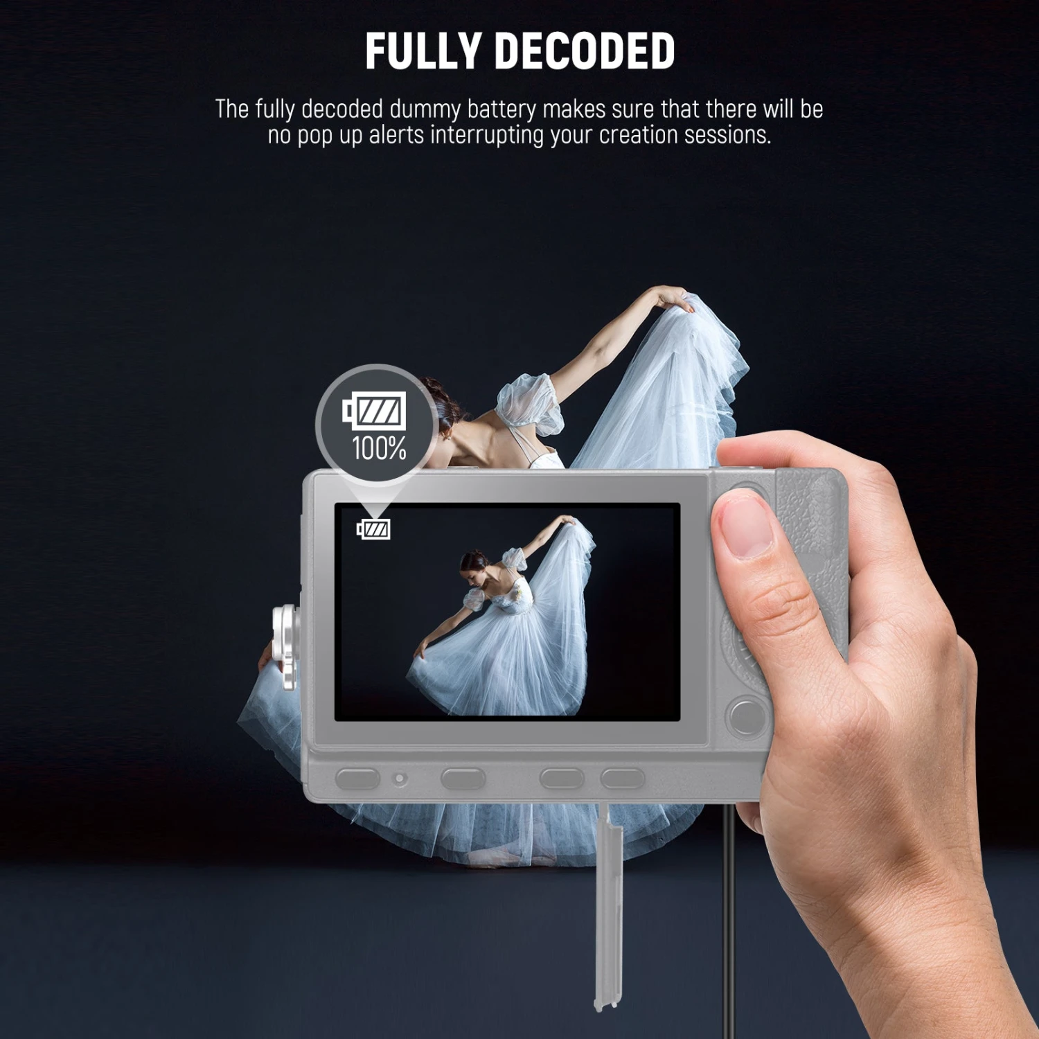 - 146″/371cm Super Length– With a 38″/97cm DC coupler, a 49″/124cm AC power adapter, and a 59″/150cm US plug AC cord, the dummy battery kit (combined length: 146″/371cm) offers ample cable length for flexible setup and positioning, adapting to various shooting environments effortlessly