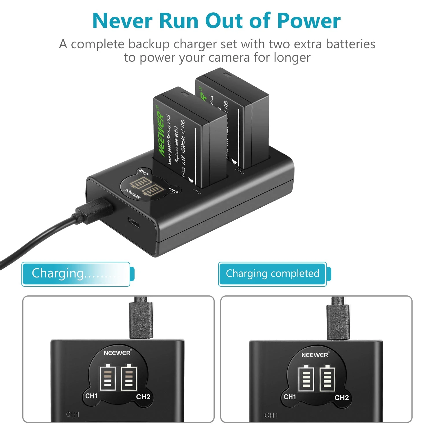 - Neewer Battery Charger Set Replacement for DMW-BLC12 battery (2 Packs) and dual USB charger is compatible with Panasonic Lumix DMC-FZ200, DMC-FZ1000, DMC-G5, DMC-G6, DMC- G7, DMC-GX8, DMC-G85, DMC-GH2 Camera.