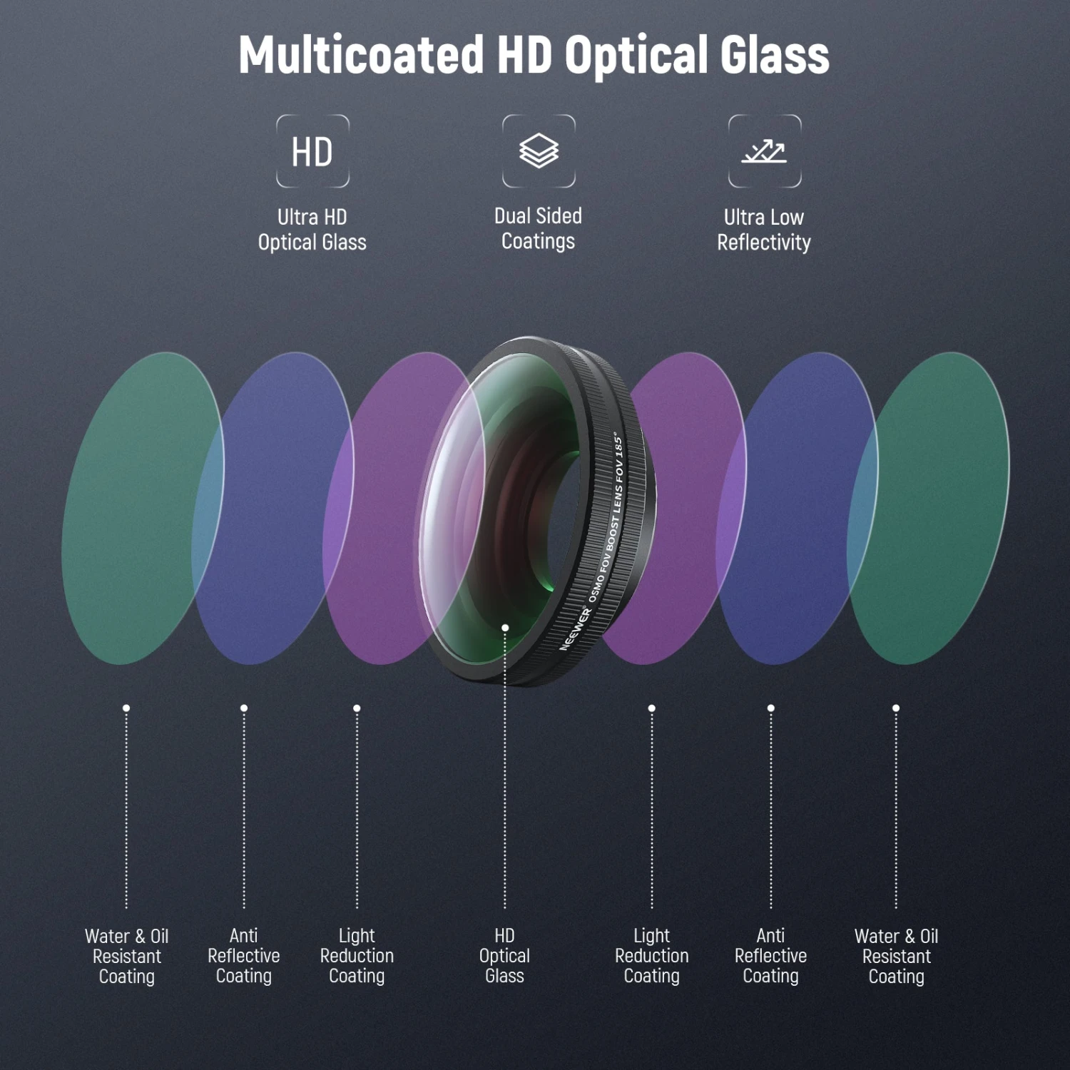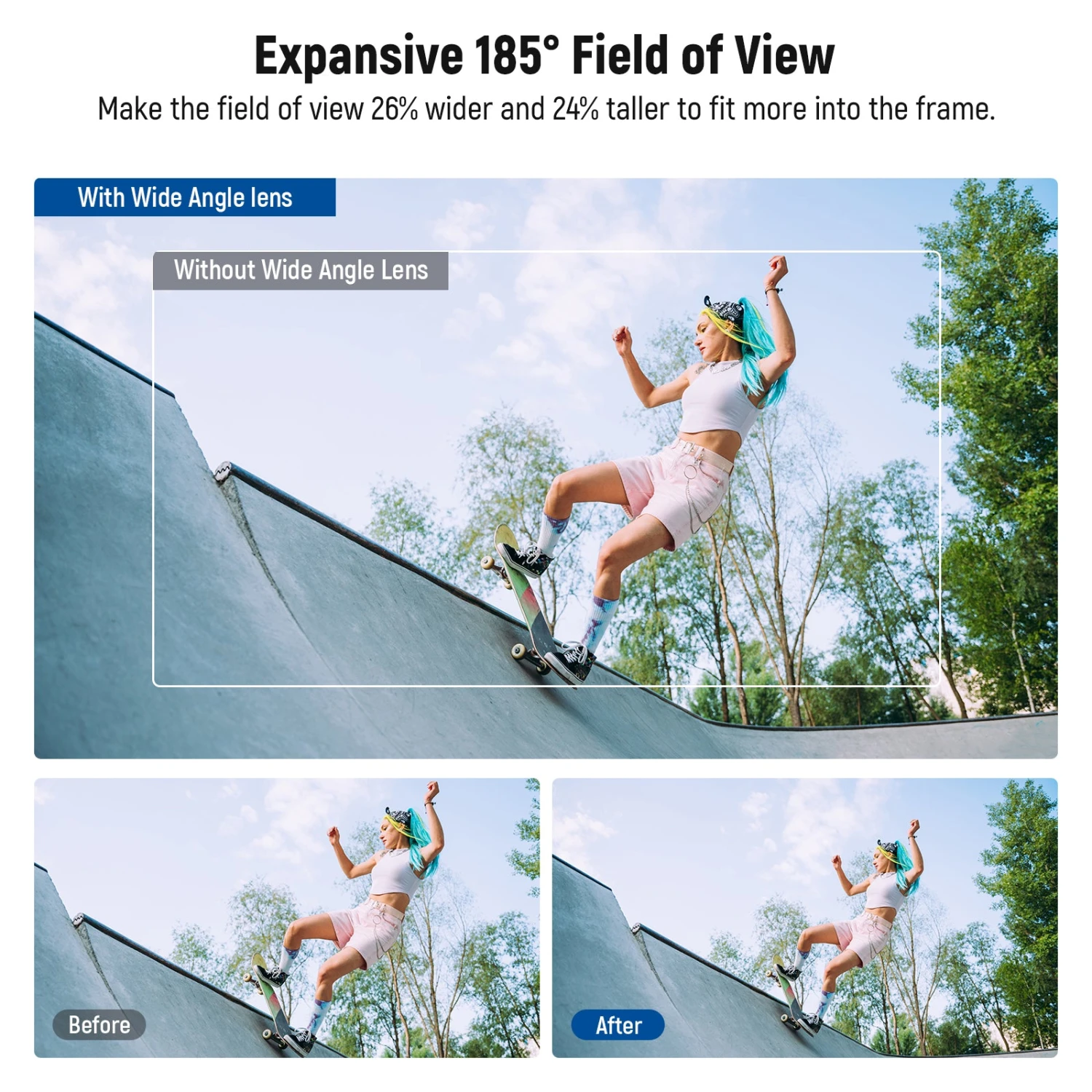 - Wide Angle Lens with 185° FOV– The wide angle lens expands the field of view (FOV) to 185° and creates a slightly distorted effect for creative shots, perfect for landscape, street photography, and group portraits. Its highly transmissive aspherical lens construction delivers exceptional clarity
