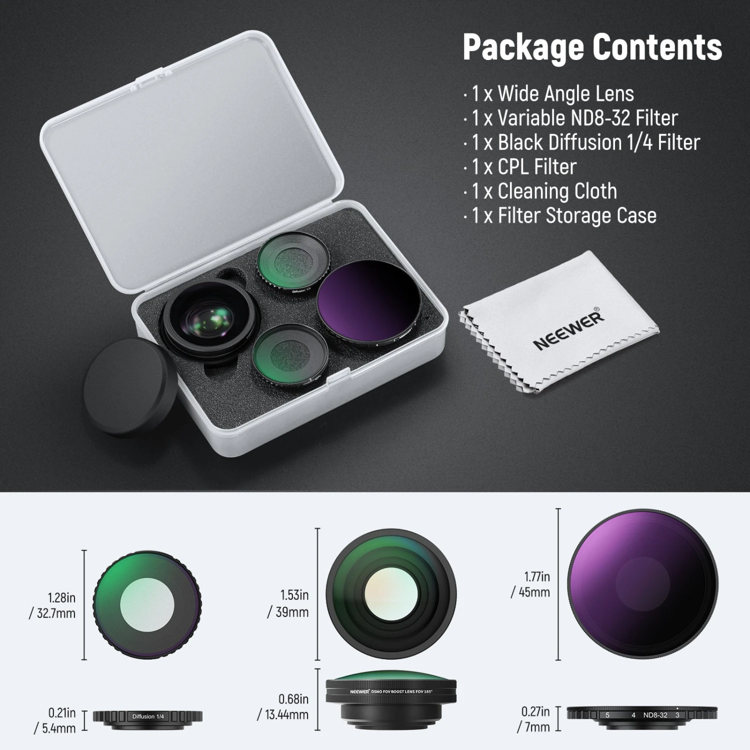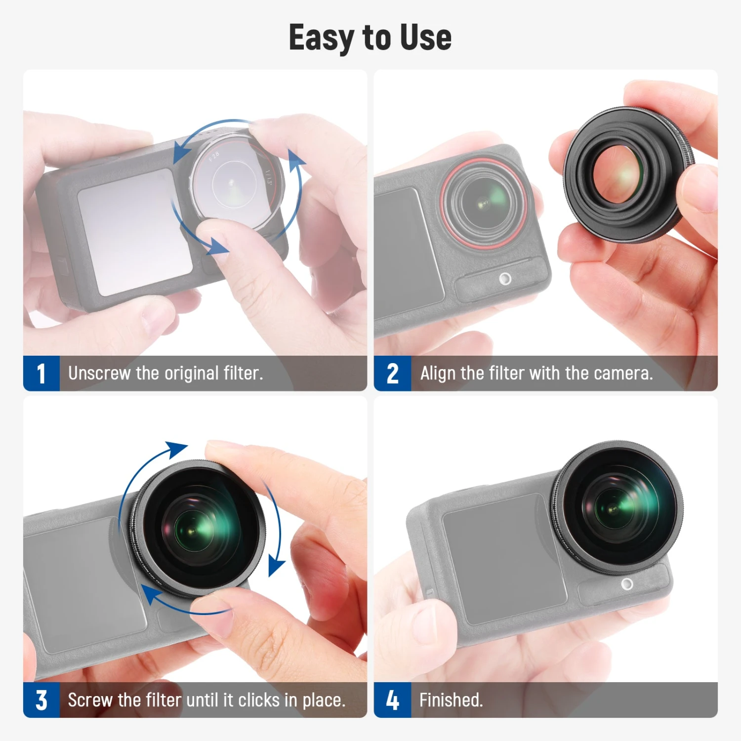 - For Action 5 Pro and Action 4 – Compatible with DJI Osmo Action 5 Pro and Action 4 Adventure Combo, this 4 in 1 set includes 3 filters and a lens for surfing, kayaking, skiing, mountain biking, skydiving, skateboarding, hiking, and other sports. Simply remove the original lens and screw them on for a quick and secure setup. Note: The filters and lens are not weather sealed and not for underwater use, as water will enter and degrade image quality