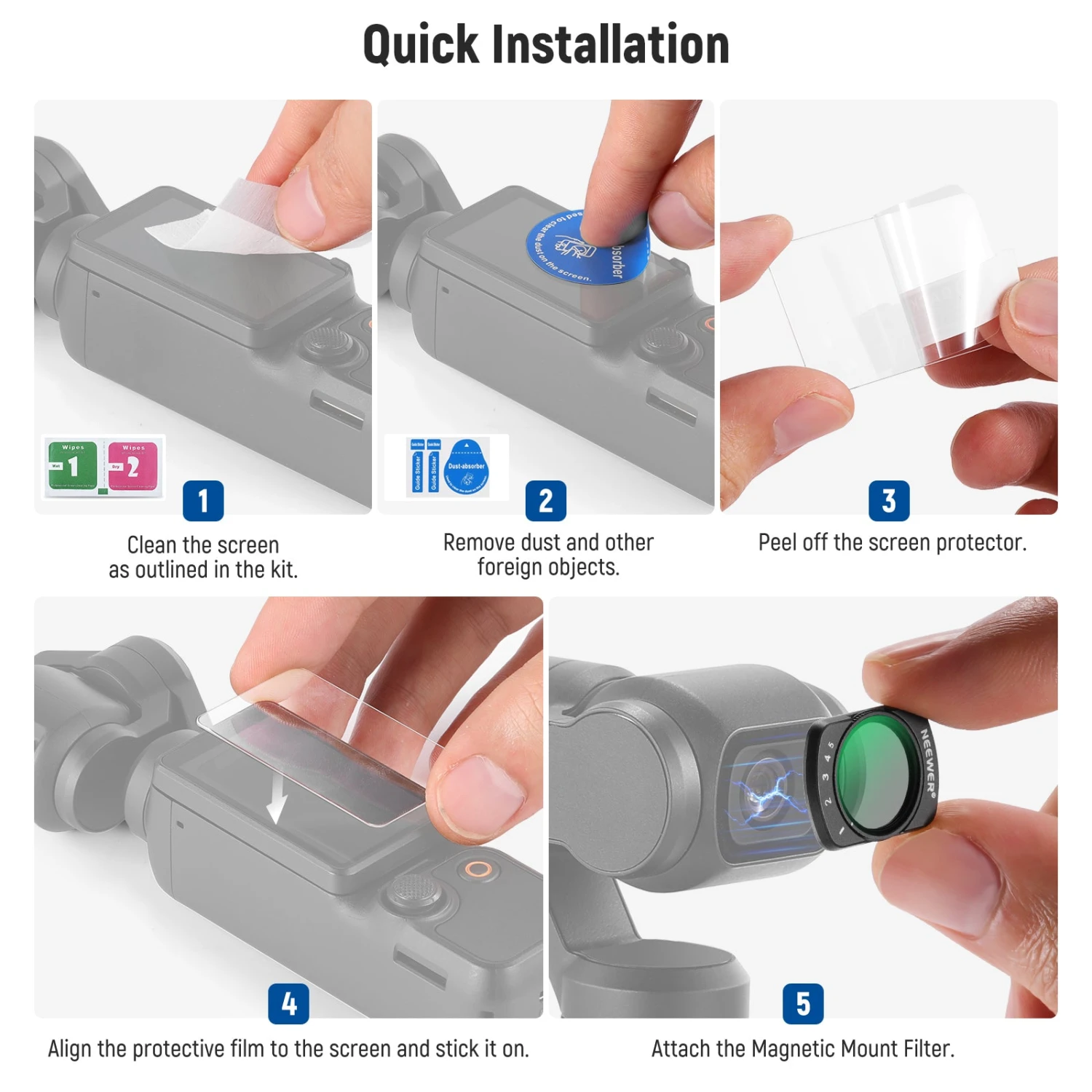 - Fully Compatible with Osmo Pocket 3– NEEWER Magnetic Variable ND2-ND32 Filter is seamlessly compatible with DJI Osmo Pocket 3, helping you to handle various light conditions with ease. From overcast to bright sunny days, simply rotate this adjustable neutral density filter to adjust the amount of light that enters your camera lens to avoid overexposure.