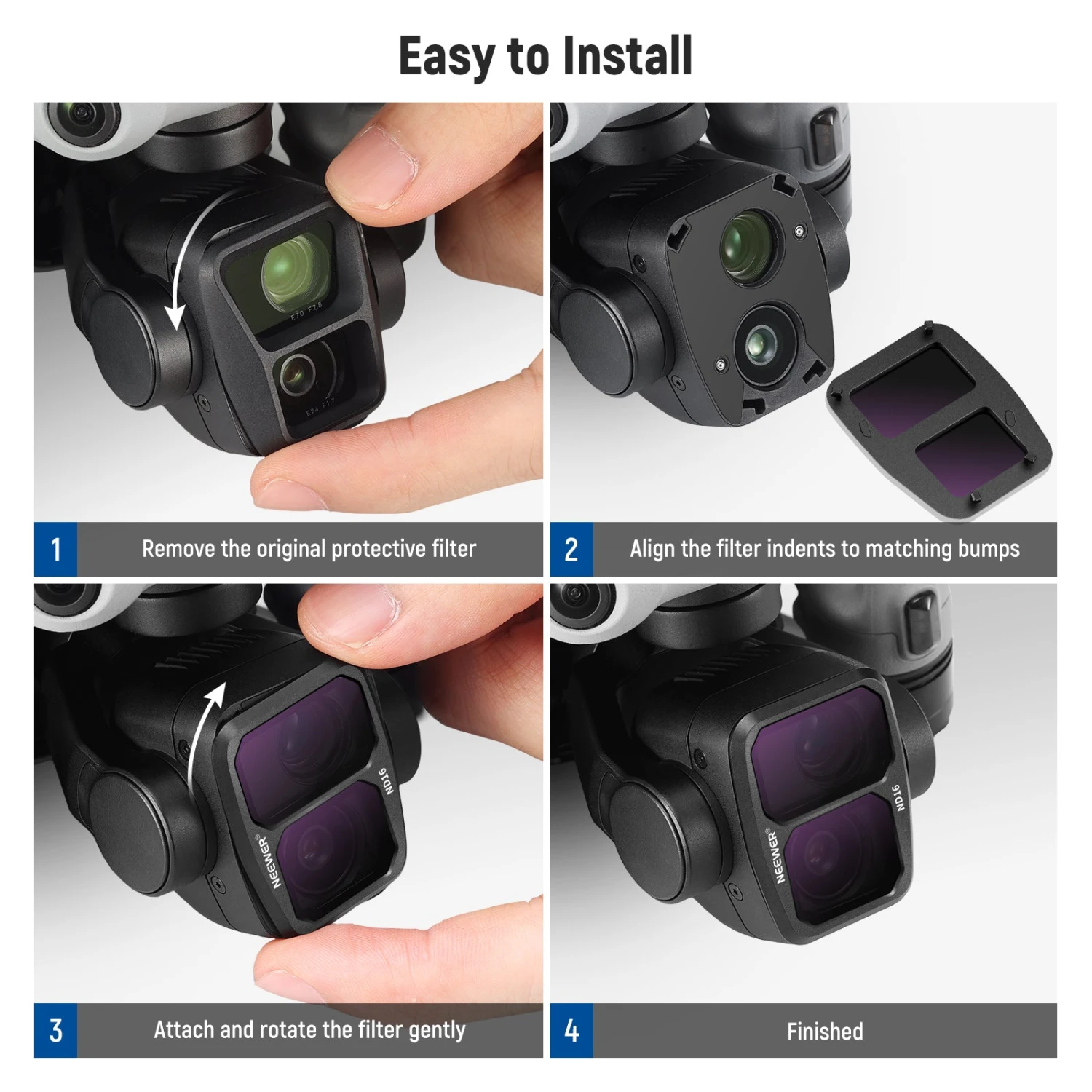- Fast & Secure Snap-On Attachment– The ultra slim and lightweight aluminum alloy frame has minimal impact on gimbal calibration (ND: 0.11oz/3.1g, CPL: 0.14oz/4g). The snap-on mounting design guarantees a tight grip on the drone lens during flight. Easy installation and removal, plus a compact carrying case for effortless transport and storage