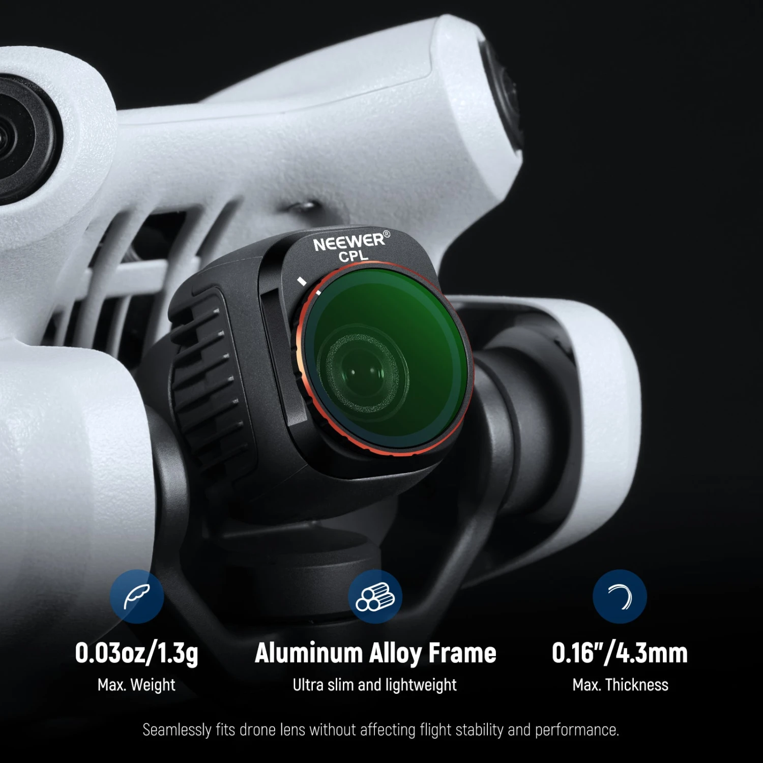 - Multi Coated Optical Glass & Snug Fit Frame– With multiple layer coatings on both sides of the high definition optical glass, these drone lens filters are water repellent, scratch resistant, and oil proof, ensuring long lasting optical quality in challenging environments. Precision machined ultra slim frame seamlessly fits the drone lens, providing a secure and burden free grip when soaring, diving, rolling, flipping, or other aerobatic flights without any impact on calibration