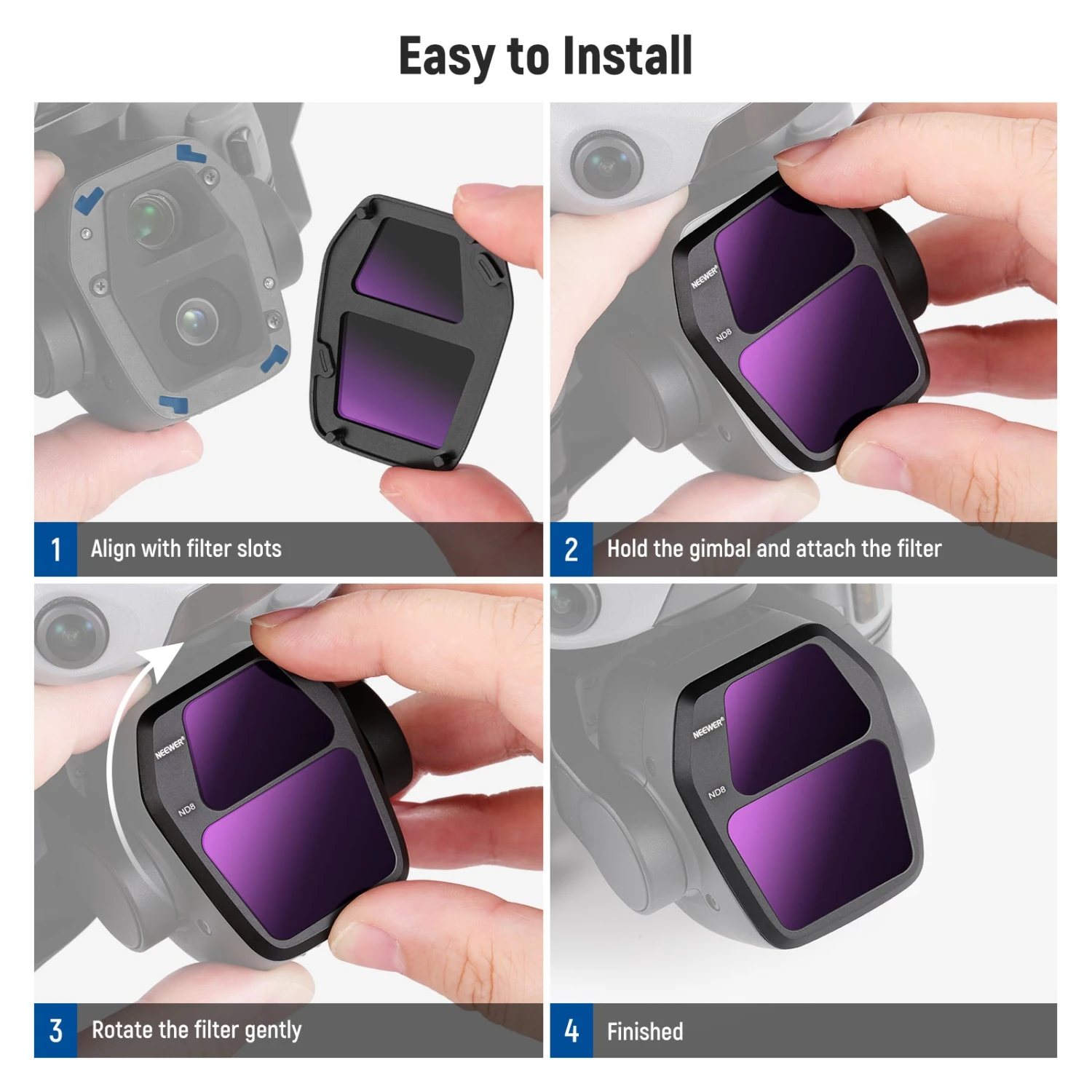 - Secure Twist On Installation– Remove the existing protective lens. Align the mounting tabs of the filter with the slots on the gimbal camera, then twist gently to secure. This ensures a firm and stable fit for smooth filming without affecting gimbal calibration