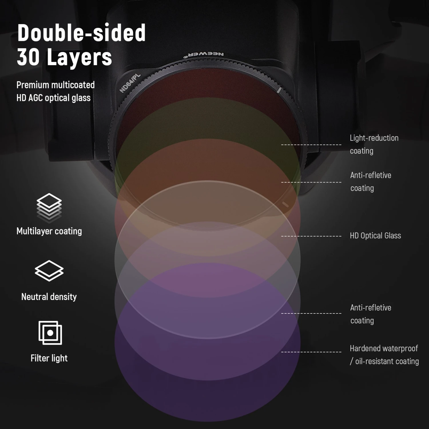 - Multi-Coated Optical Glass– 30-layer multi-coated optical glass lens filters ensure crystal clear footage. The coatings are water-resistant, oil-resistant, and scratch-resistant, reducing lens flares and reflections