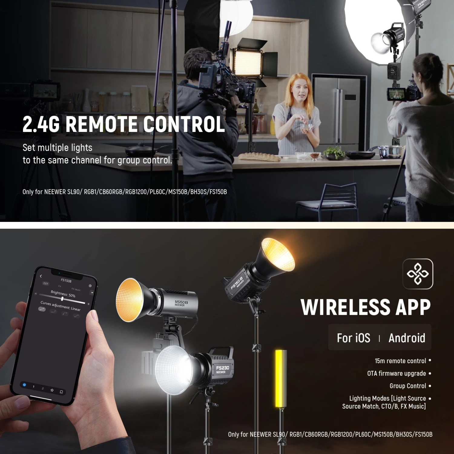 - Infinity App & 2.4G Wireless Control– The NEEWER APP supports group control and OTA firmware updates. It also provides Light Source, FX Music, and other functions for advanced lighting control. The built in 2.4G system supports group control of different models (SL90 Pro, RGB1, RGB C80, RGB 1200, MS60C, MC60B, MS150B, BH30S, FS150B, CB200B, and CB60B) in 00-99 channels. When all lights are set in the same channel, setting 1 light can make others change in tandem