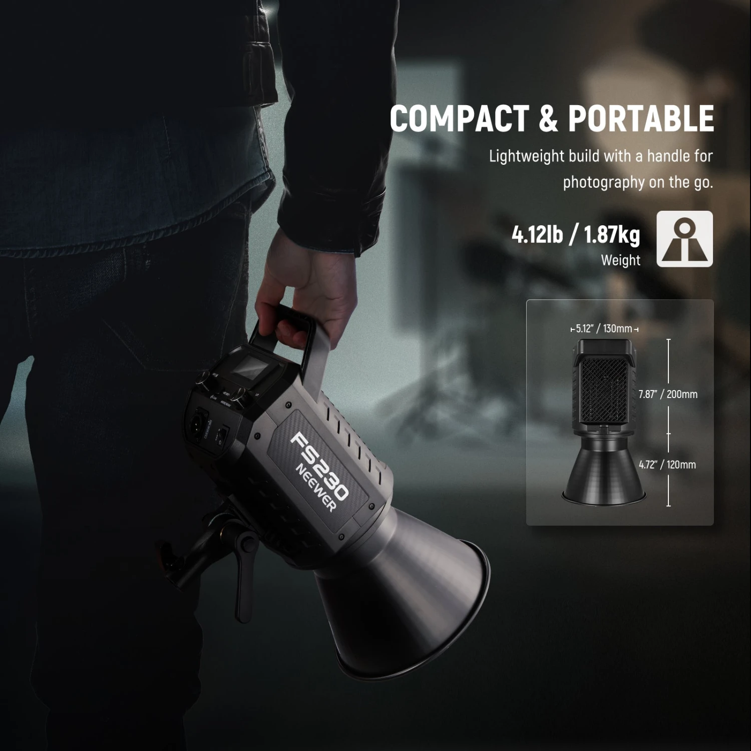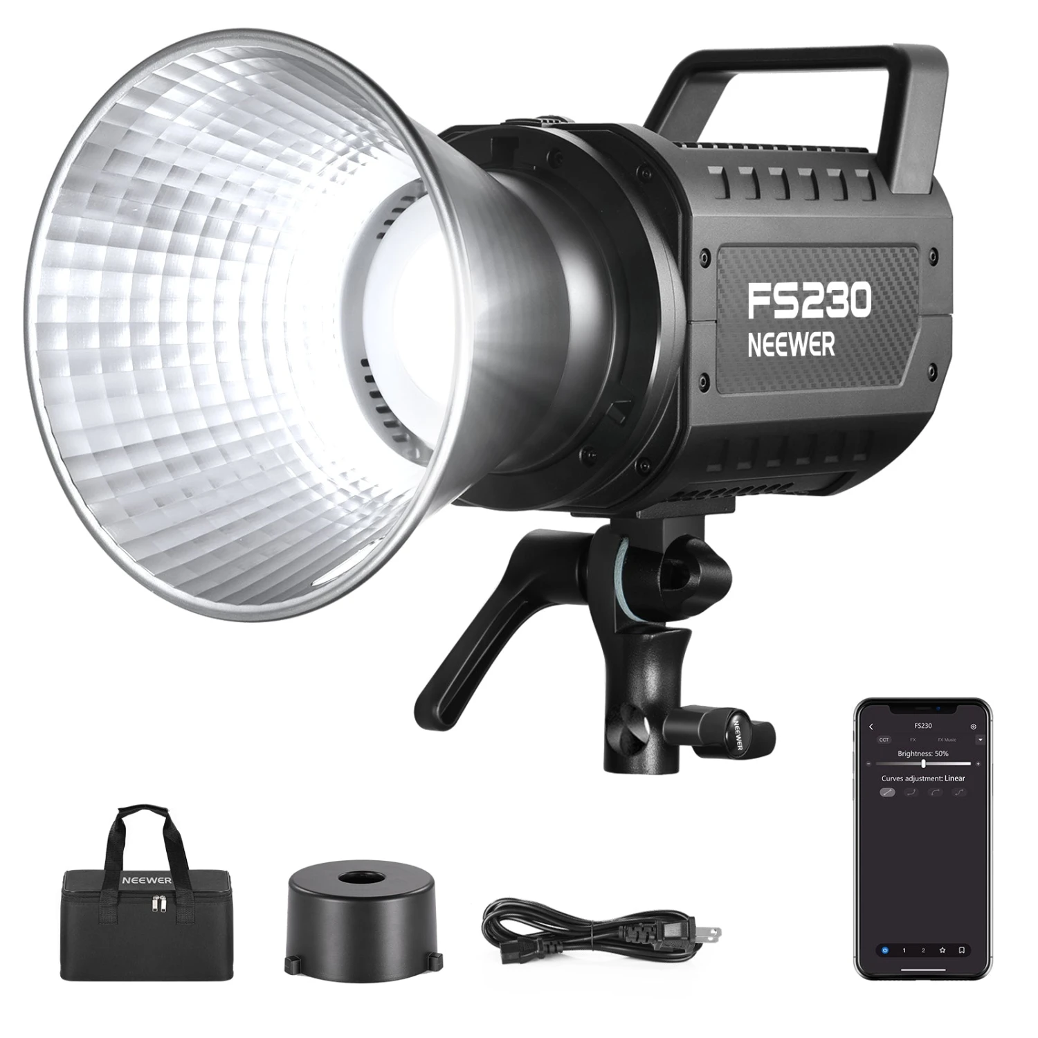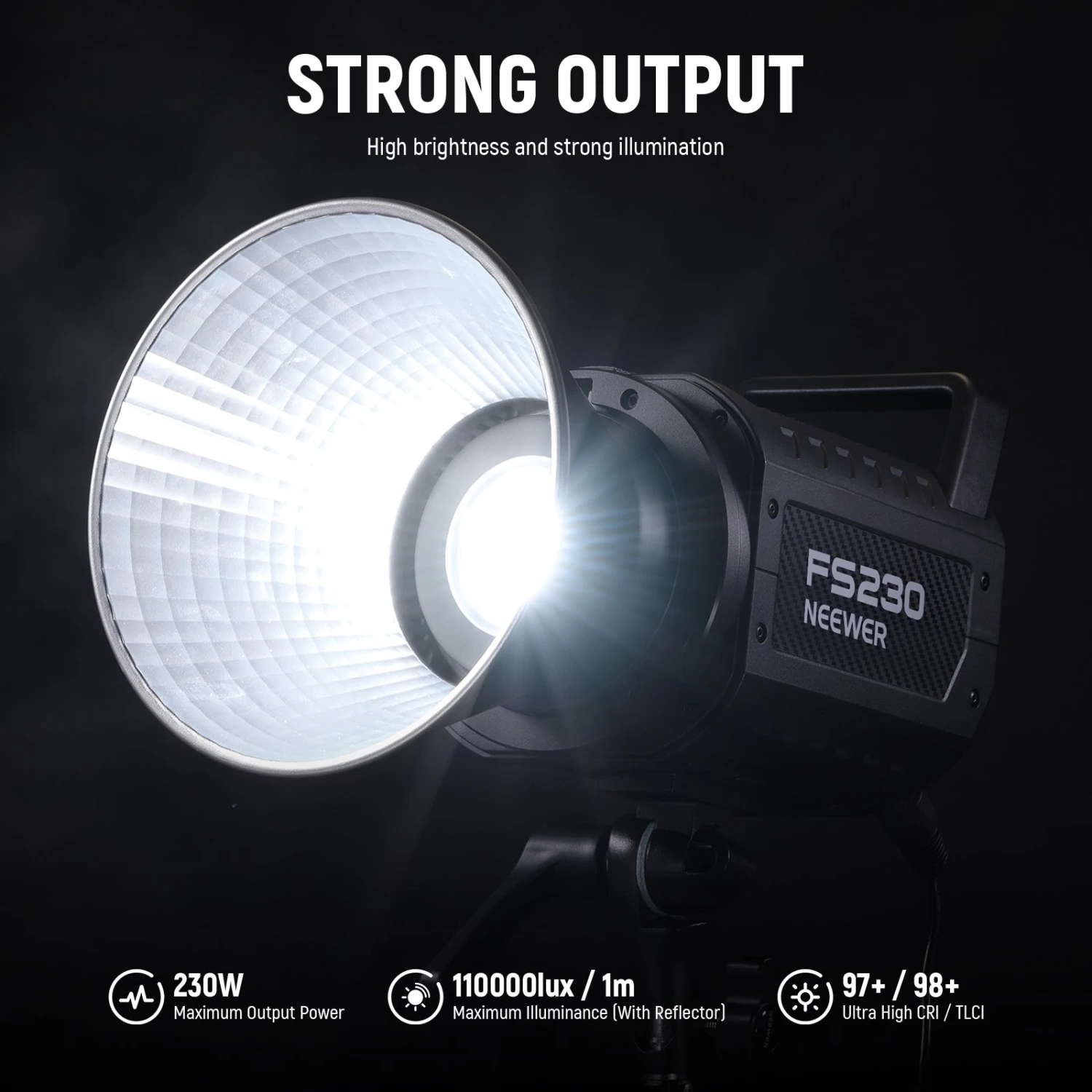 - 230W Powerful Compact Studio Light– NEEWER FS230 LED Video Light (US Plug) uses efficient COB LED for exceptional 230W output and 110000lux/m maximum illuminance. The portable spotlight weighs only 3.8lb/1.7kg, measures 7.9″x5.1″x4.7″/200x130x120mm, and has a flexible 180° tilt stand mount adapter, ideal for portrait photography lighting, interviews, YouTube/TikTok video recording, filming, live streaming, and studio production