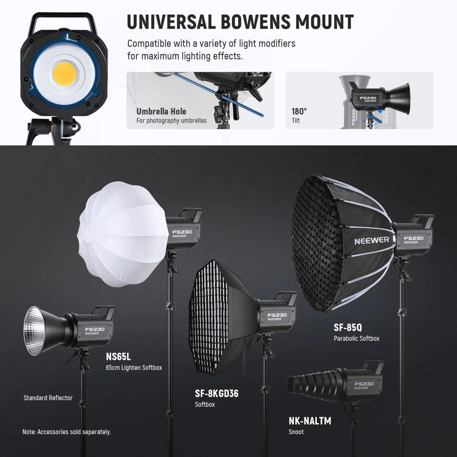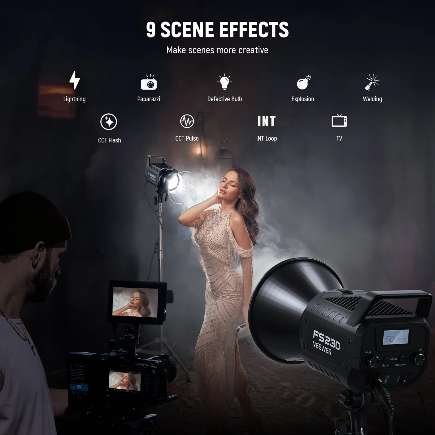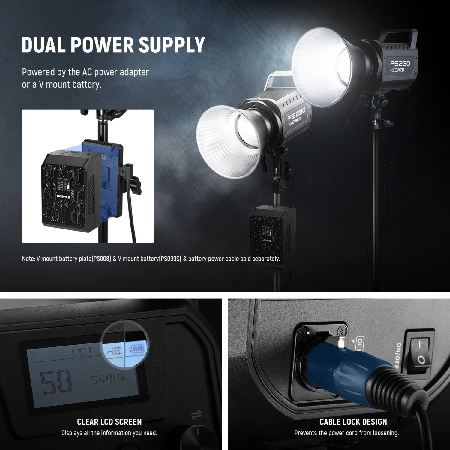 - 230W Powerful Compact Studio Light– NEEWER FS230 LED Video Light (US Plug) uses efficient COB LED for exceptional 230W output and 110000lux/m maximum illuminance. The portable spotlight weighs only 3.8lb/1.7kg, measures 7.9″x5.1″x4.7″/200x130x120mm, and has a flexible 180° tilt stand mount adapter, ideal for portrait photography lighting, interviews, YouTube/TikTok video recording, filming, live streaming, and studio production