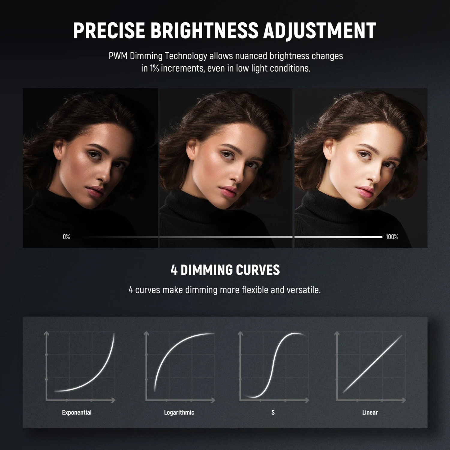 - Precise PWM Dimming & 5600K Daylight– PWM dimming technology enables 0-100% precise brightness adjustment at 1% increments without flickers and provides 4 dimming types (exponential, logarithmic, S, and linear) for accurate dimming in different conditions. 5600K cool daylight offers a uniform color temperature. High CRI 97+ and TLCI 98+ ensure faithful color rendition. 9 FX effects make videos creative and distinct