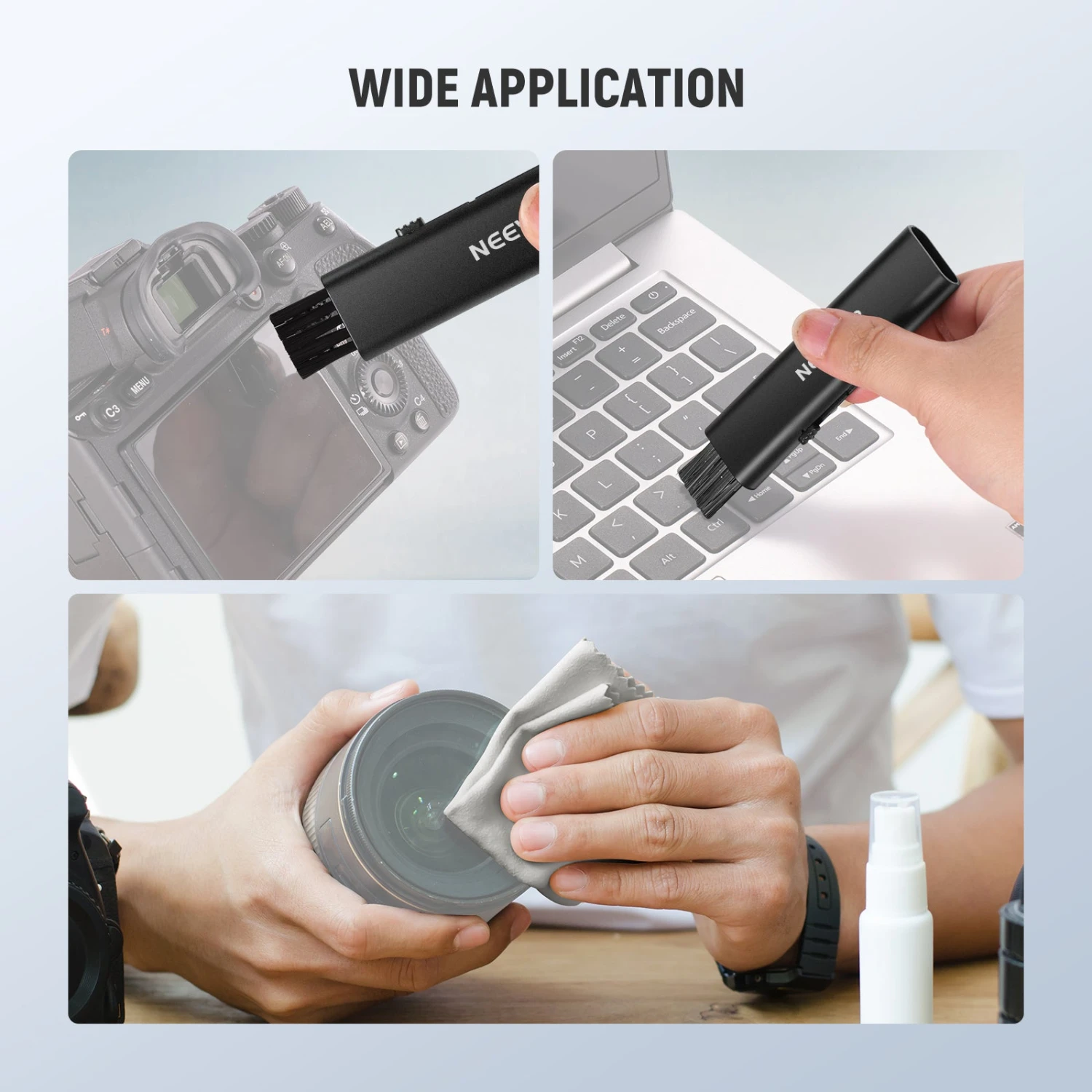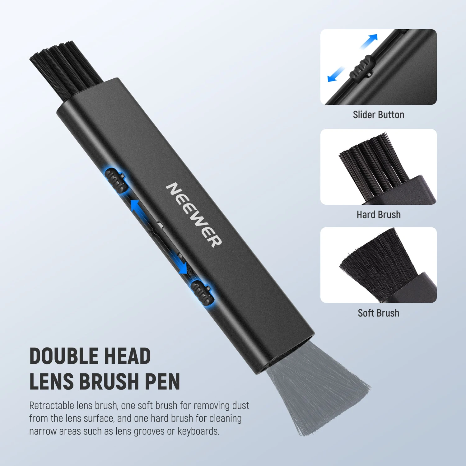 - Double Head Lens Brush Pen– The retractable brush pen features two ends—a soft brush for removing dust from the lens surface and a firm brush for cleaning narrow areas like lens grooves or keyboards