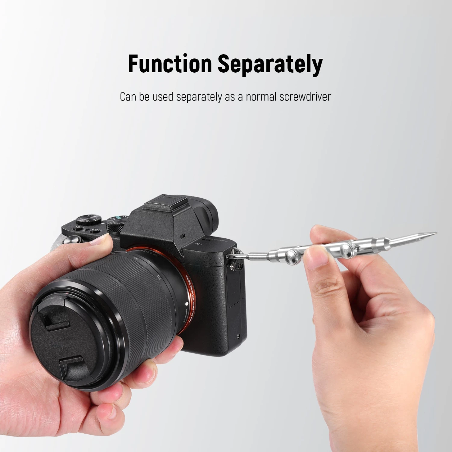 - Pointy/Flat Double Sided Tips– This lens spanner features both pointed tips and flat tips to fit standard hole notches and slotted notches on lens retaining rings respectively. Four screws included to securely lock the arms and rails with extra stability