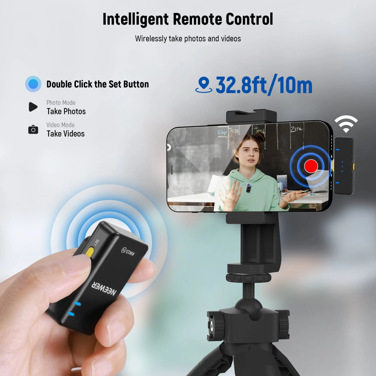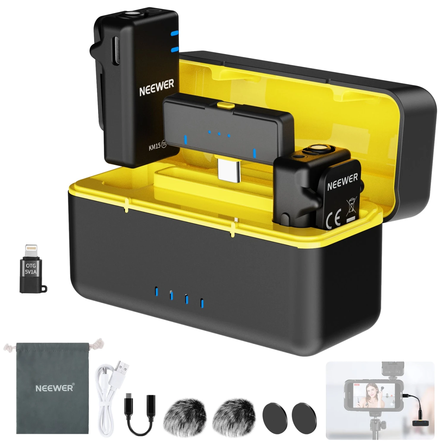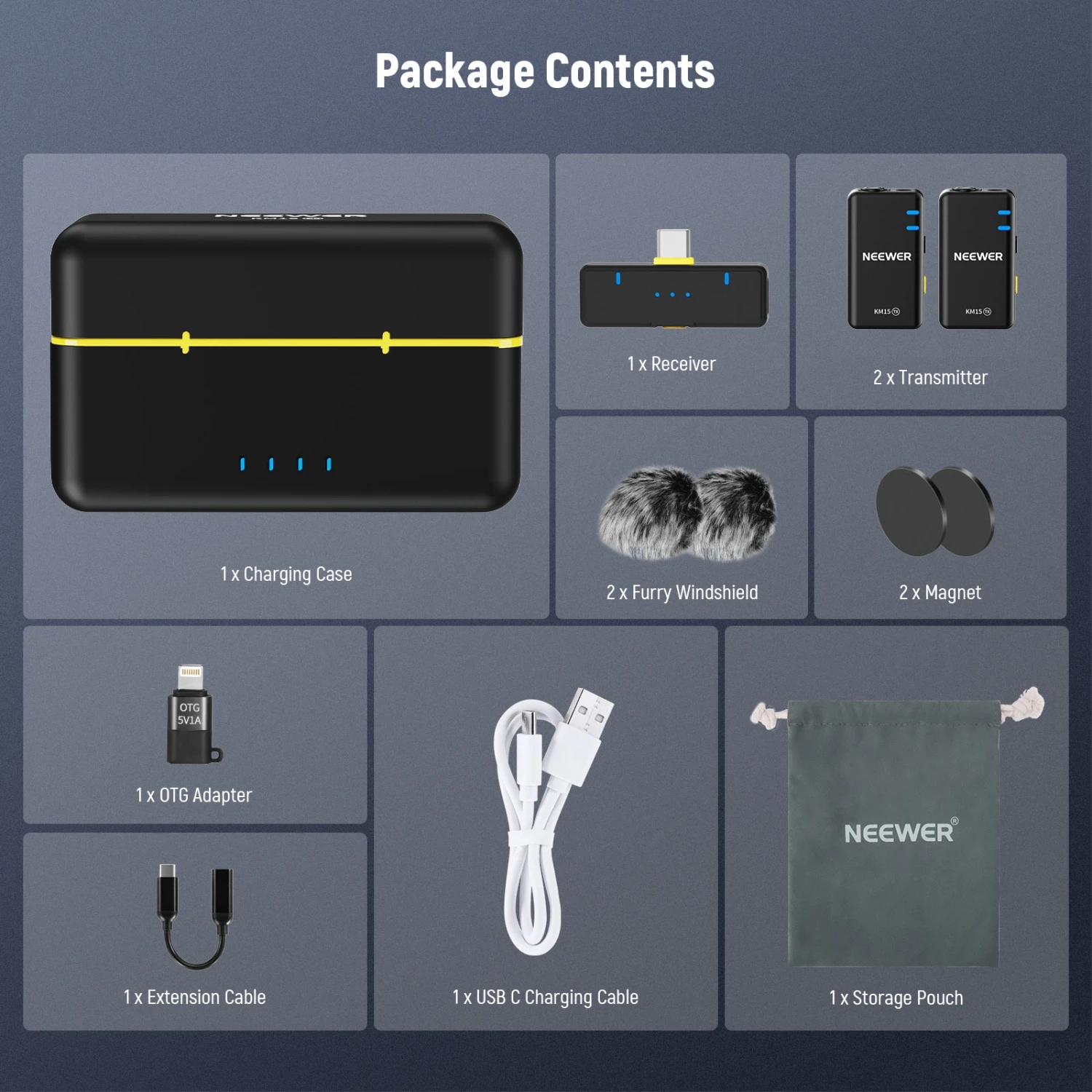 - Mini Wireless Lavalier Lapel Mic– This wireless microphone system features two transmitters (TX) with a MUTE summary and SET summary for photo capture (double press), a USB C receiver (RX) that offers 3 volume levels, and a portable charging case. Upgraded with a 48kHz/24bit sampling rate and 76dB signal to noise ratio, also compatible with NEEWER CM28 Max