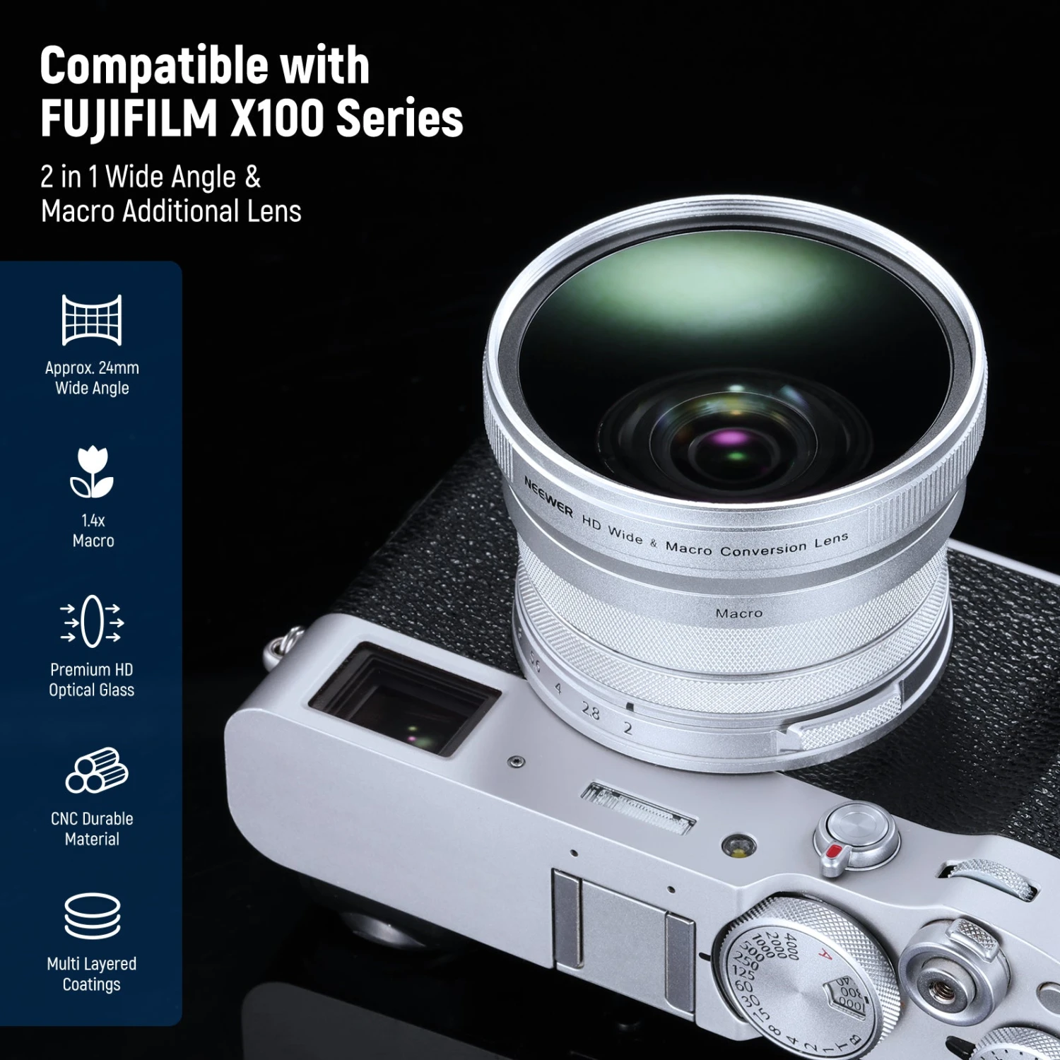 - Fully compatible with X100 Series Cameras– NEEWER LS-47 2 in 1 additional lens combines a wide angle lens for a broader field of view and a macro lens for detailed close ups. Comes with a 49mm adapter ring to be fully compatible with Fujifilm X100 X100S X100F X100T X100V X100VI cameras