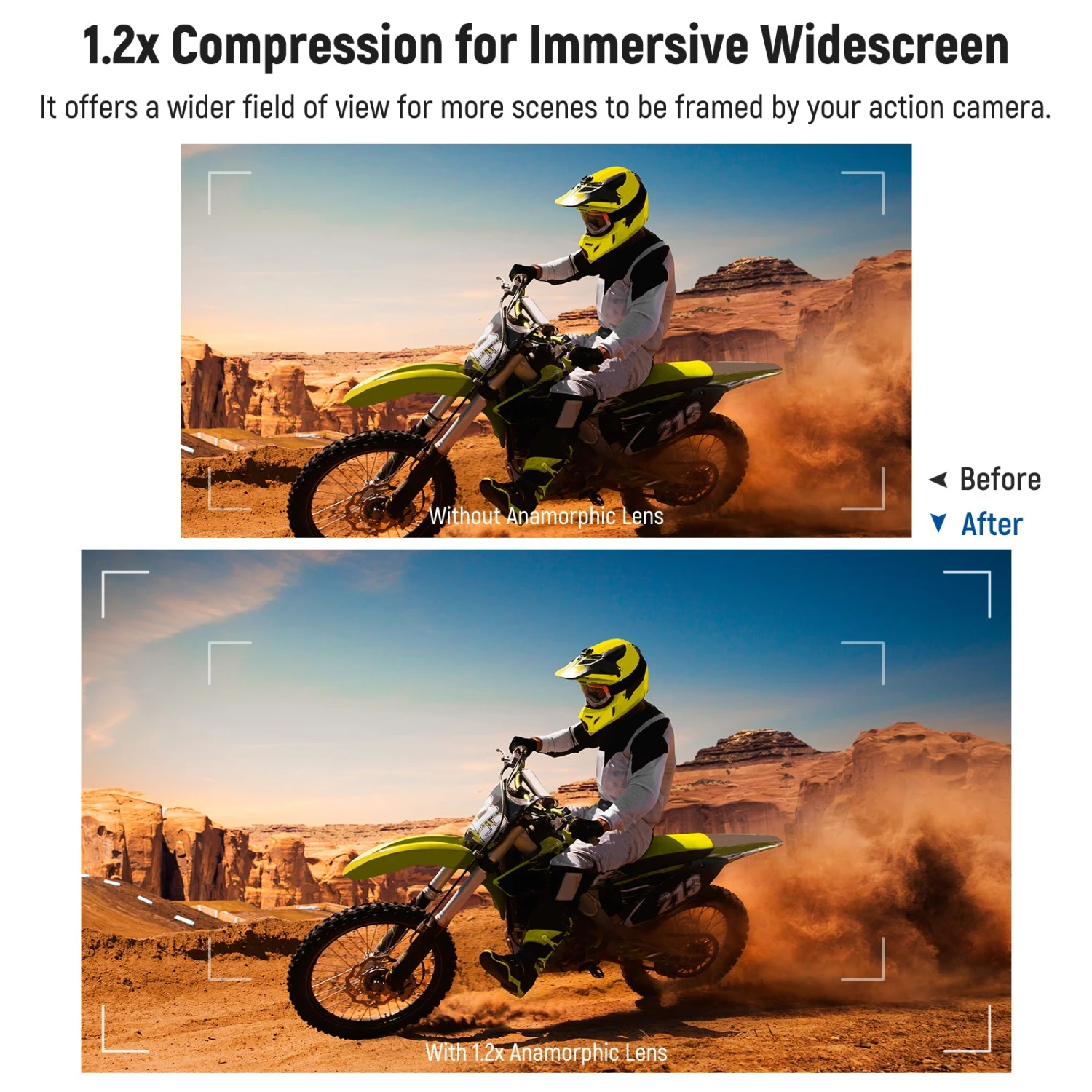 - 1.2x Compression for Immersive Widescreen– NEEWER 1.2x anamorphic lens is seamlessly compatible with hero 12 11 10 9. It offers a wider field of view for more scenes to be framed, creating enticing movie footage like a Hollywood blockbuster. Note 1: Do not move the camera too fast to avoid the jelly effect. Note 2: Please turn off the video stabilization function to avoid distortion of the image