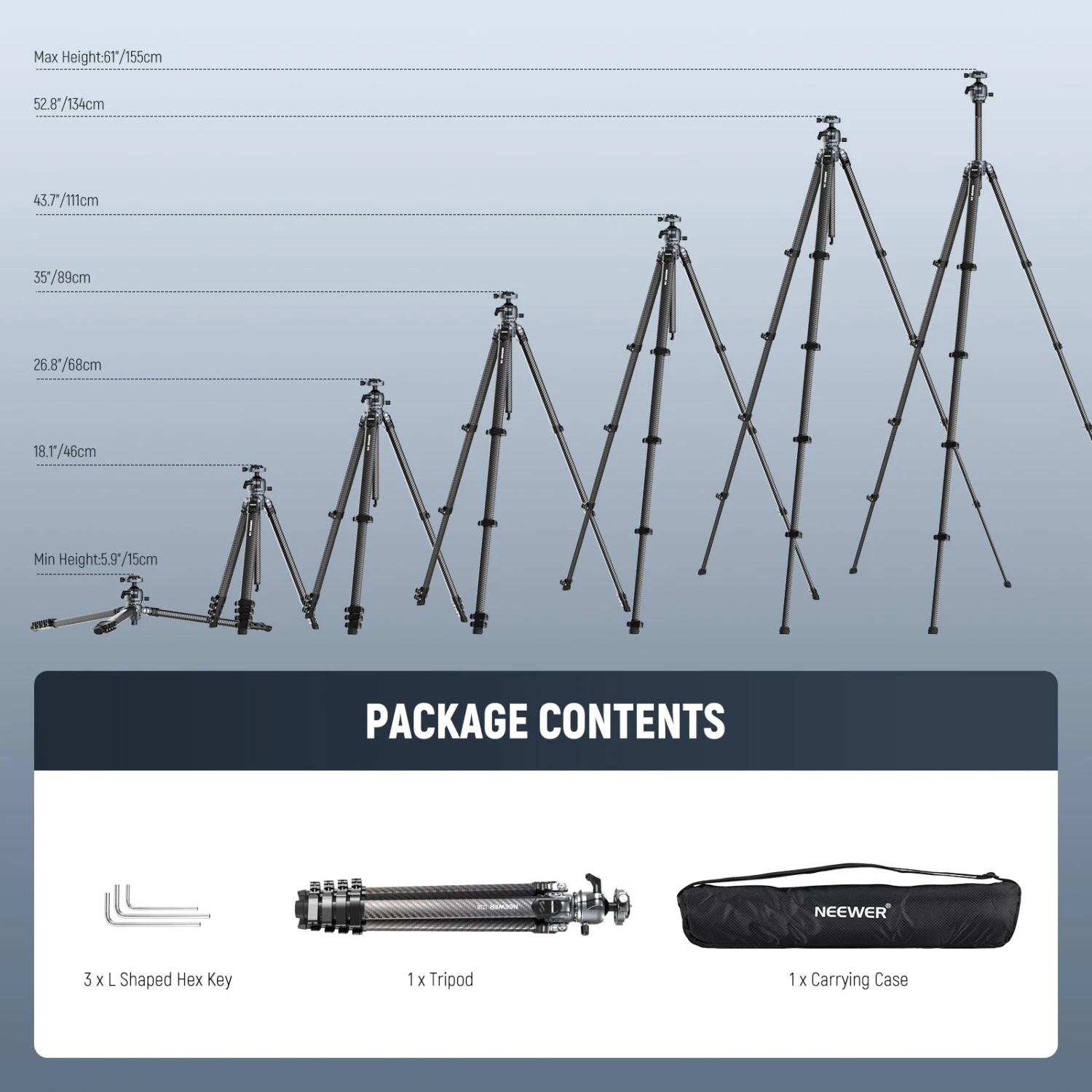 - Compact, Lightweight but Stable Travel Tripod– Crafted from carbon fiber, this LITETRIP LT38 compact camera tripod weighs only 3.15lb/1.43kg but enhances its maximum load capacity to 22lb/10kg, even upgraded with all metal height adjustment buckles and nonslip rubber feet for added stability. Tightly fitted legs fold down to a handheld diameter of 2.7″/7cm and a compact folded length of 19.7″/50cm, with a storage bag for easy portability