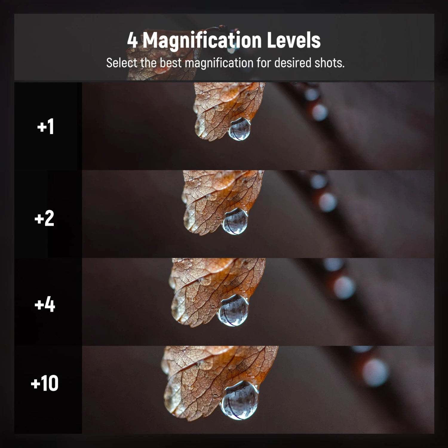 - Four Magnification Levels– Four close-up filters offer +1, +2, +4, and +10 diopter strength for different magnification levels. With them, you can capture the fine details of flowers, leaves, vegetables, plants, stones, insects, and other subjects