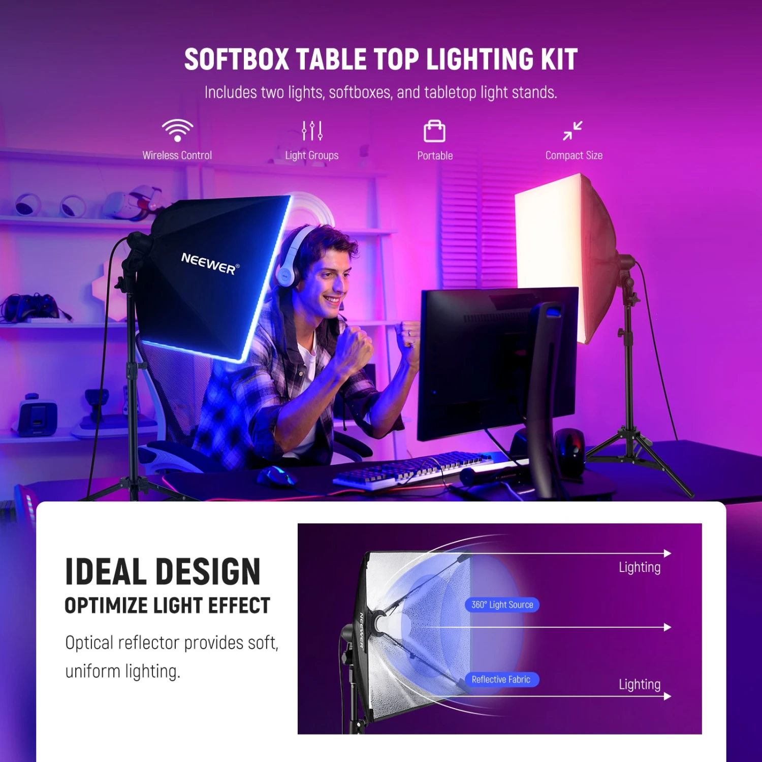 - Comprehensive Studio Lighting Kit– Includes 2 x compact square softbox, 2 x full color RGB bulb, 2 x adjustable light stand, 2 x diffusion cloth, and 1 x carrying bag, bringing you a professional lighting setup for live streaming, portraits, product photography, and many other creative endeavors
