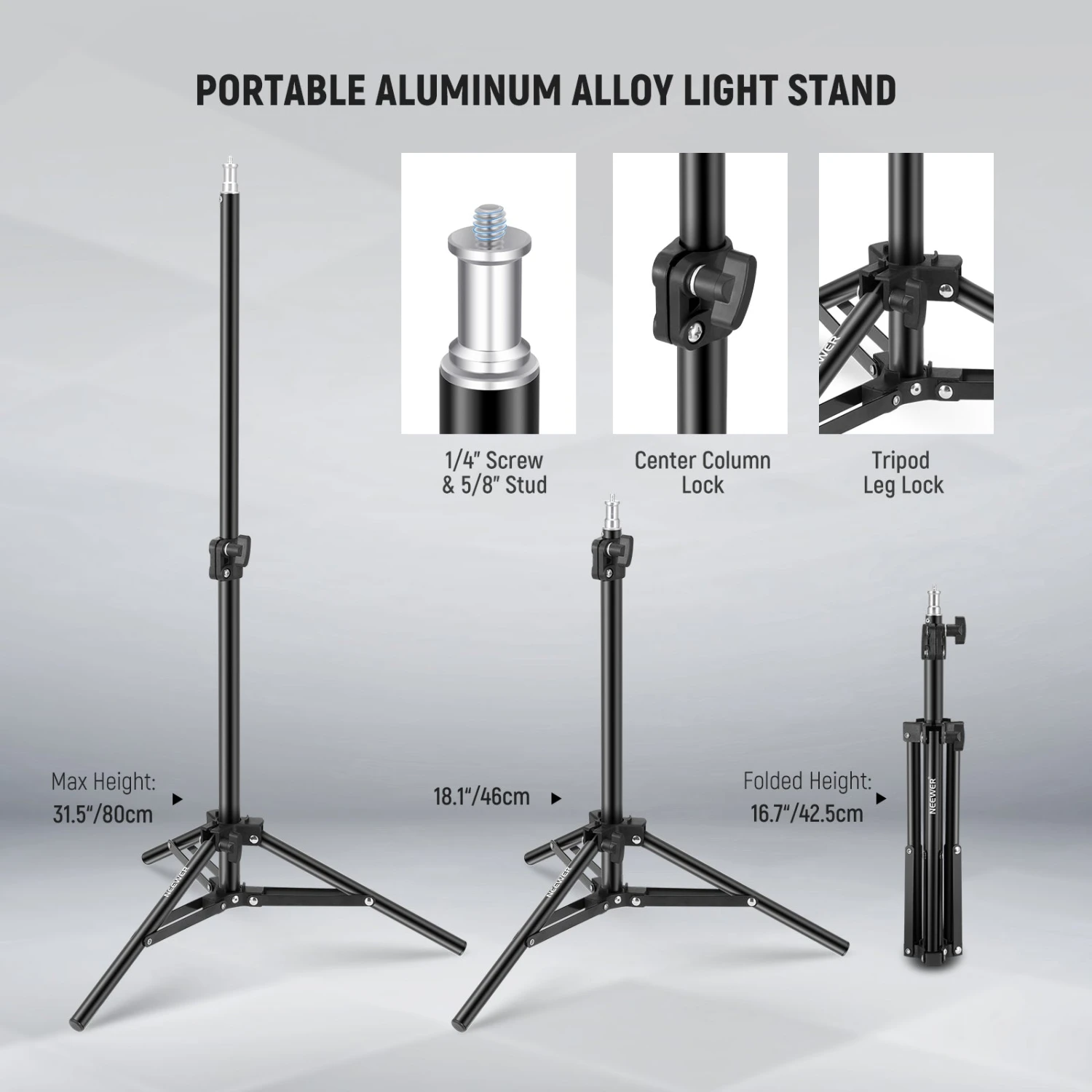 - Portable, Height Adjustable Light Stands– Our light stands offer a height range of 18.1″-31.5″/46-80cm for flexible positioning. Constructed of robust yet lightweight aluminum alloy, these folding light stands combine durability and portability, perfect for desktop or small scale lighting setups. The design of a 5/8″ stud and 1/4″ threaded hole enables the mounting of a wide array of equipment