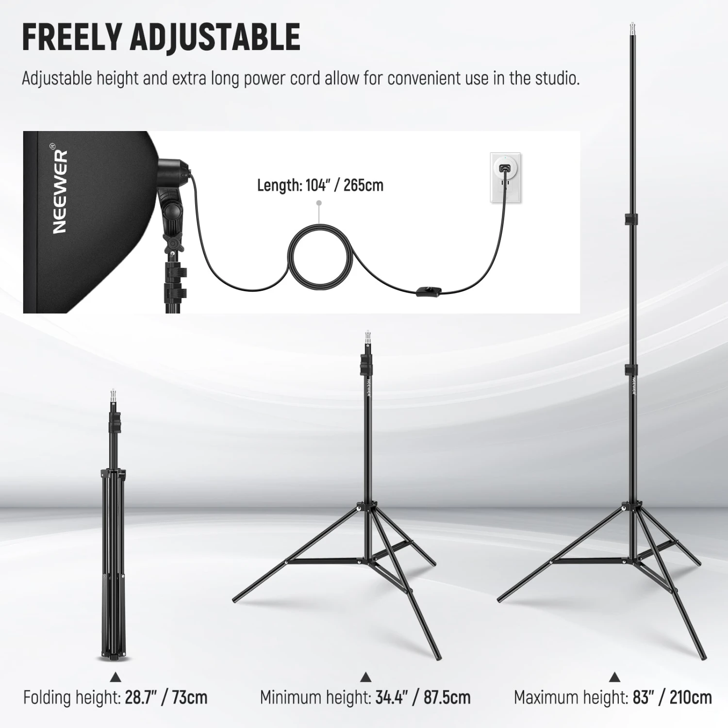 - 83″/210cm Light Stand: Constructed from aluminum alloy, giving them exceptional strength for heavy duty work. And use quick single action locks, providing fast precision height adjustment. (1)Comes with carrying bag to transport and protect the equipment easily