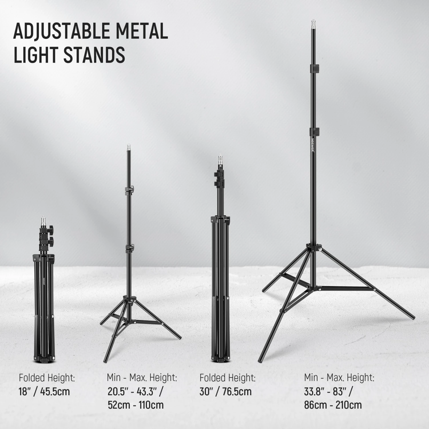 - Adjustable Metal Light Stands– 3 light stands are included. 2 high light stands with 3 sections offer a maximum height of 83″ (210cm), and the short light stand with 2 sections can extend to 43.3″ (110cm) for lighting in low positions. E26 light bulb sockets are included, and 11′ (336cm) prolonged cables let you deploy the lighting easily