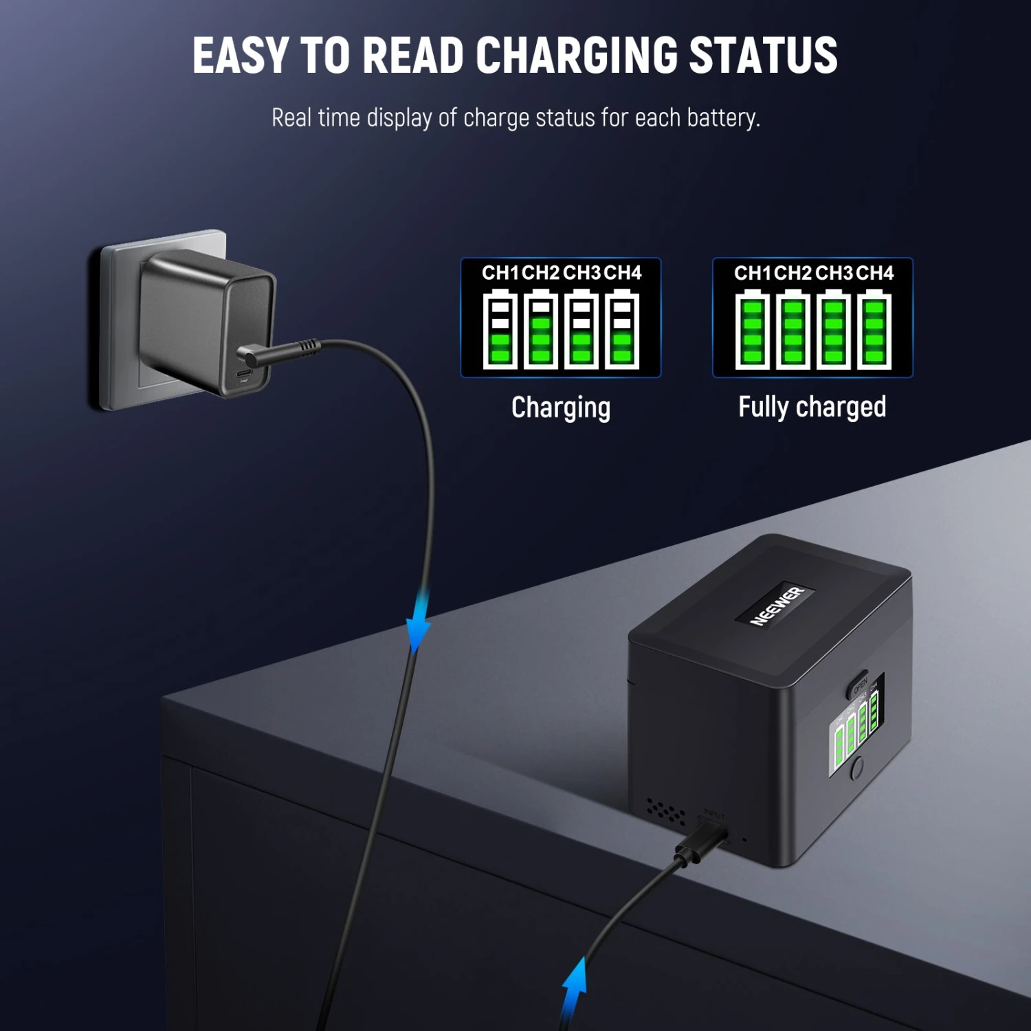 - PD 40W Fast Charging– The NW-ZP4 charger supports up to PD 40W fast charging, delivering quick power restoration. Charges four 2400mAh NP-FZ100 or LP-E6 series batteries to full in just 2.75 hours using the included PD USB C cable, minimizing downtime and keeping your shoots on track. Note: To achieve full power output, it’s strongly recommended to use a PD 40W charger or higher