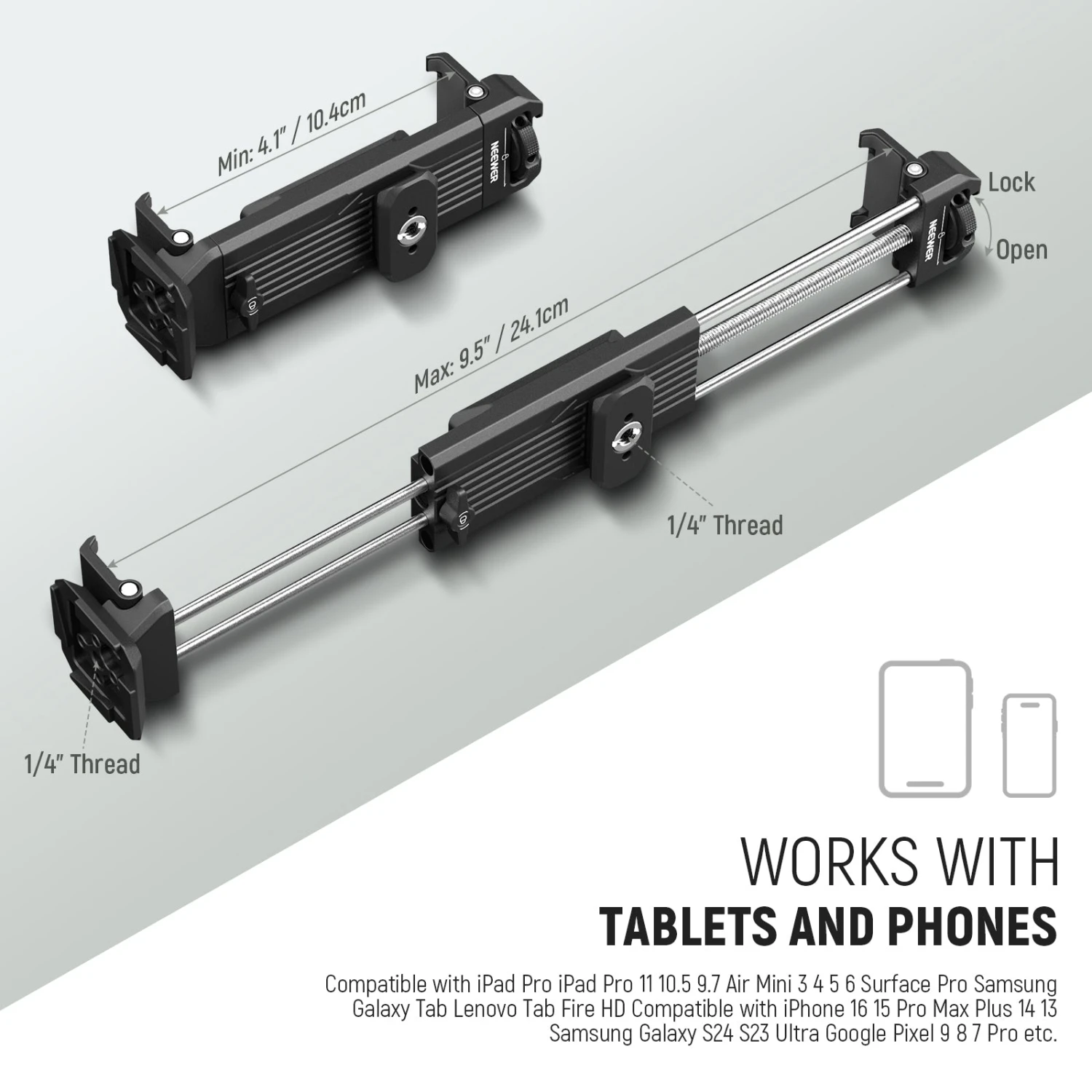 - For Tablets & Phones– Open the clamp, adjust the width (4.1″-9.5″ wide, 0.6″ thick), insert your phone or tablet, and start using. Compatible with iPad Pro 11 10.5 9.7 Air Mini 3 4 5 6 Surface Pro Samsung Galaxy Tab Lenovo Tab Fire HD series and more, compatible with iPhone 16 15 Pro Max Plus 14 13 Samsung Galaxy S24 S23 Ultra Google Pixel 9 8 7 Pro, etc., the tablet stand supports portrait and landscape modes, even enabling vertical monitoring for smartphones