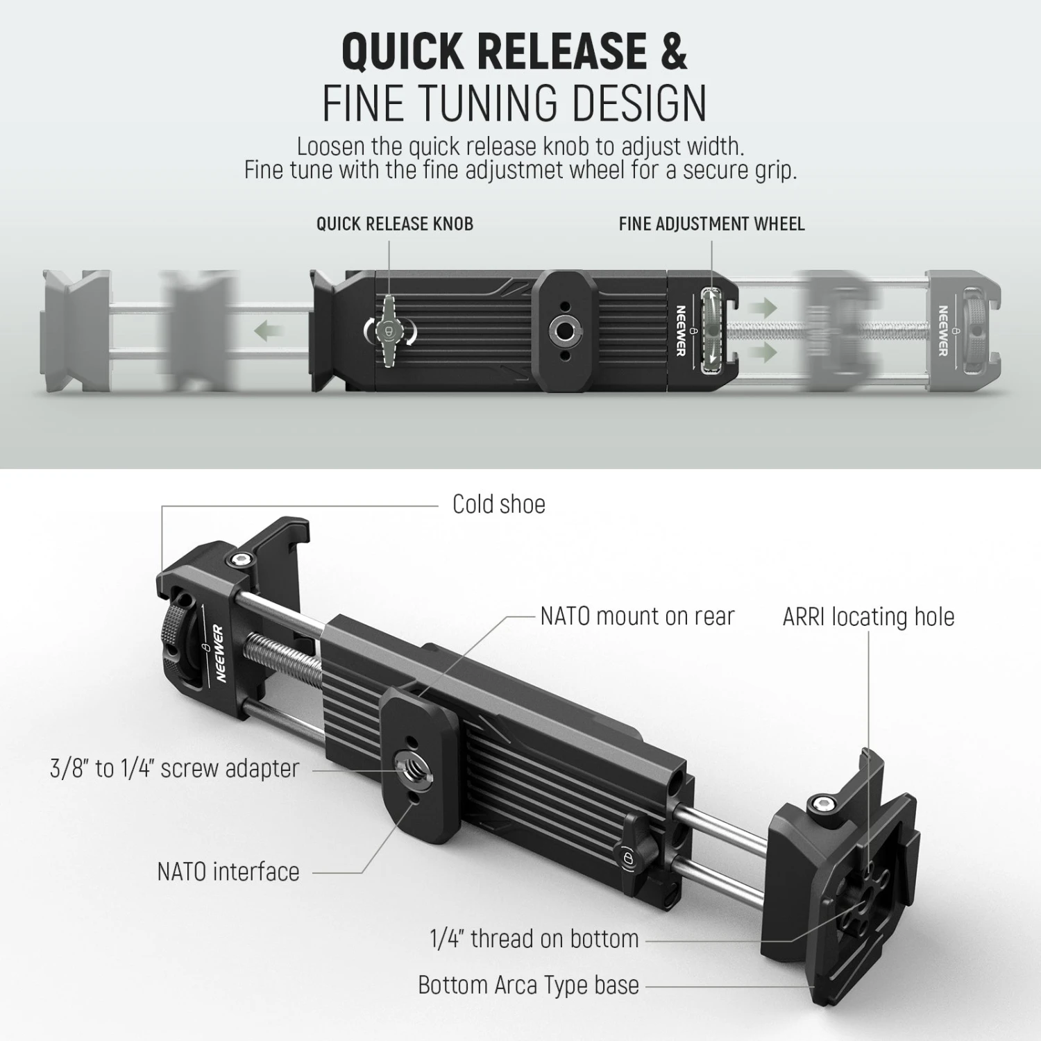 - Quick Release & Fine Tuning Design– Simply release the quick release knob and adjust the width accordingly. The fine tuning thumb screw allows for further adjustments and ensures a secure grip. The spring less design prevents any potential damage to your device, with the locking mechanism being both stable and reliable