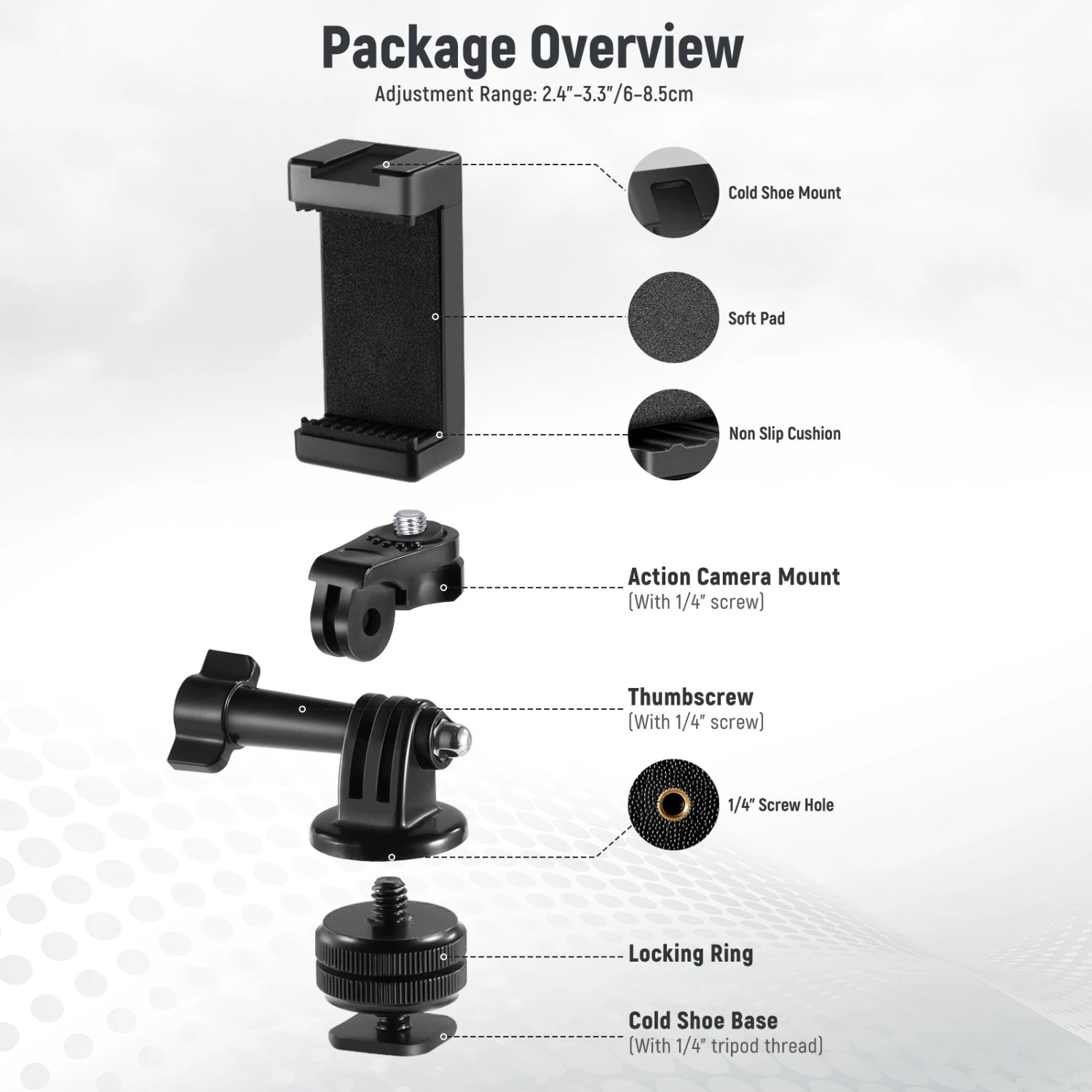 - Package contains: 1x Hot Shoe Mount (with 1/4″ tripod thread), 1x Action Camera mount (with 1/4″ tripod connection), 1x Thumbscrew,1x Action Camera mount adapter (with 1/4″ tripod thread), 1x Universal Phone Holder (with 1/4″ tripod connection)