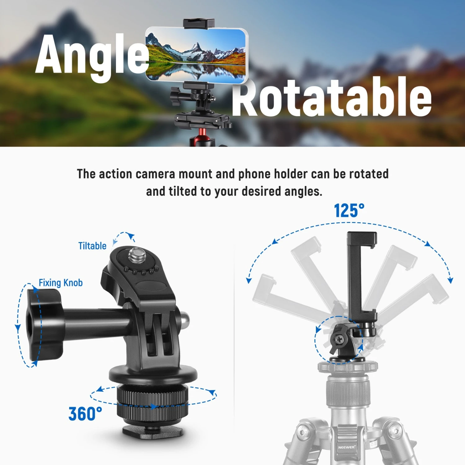 - The action camera mount with 1/4″ thread and phone holder can be installed on a tripod, and both of them can be rotated and tilted to desired angles.