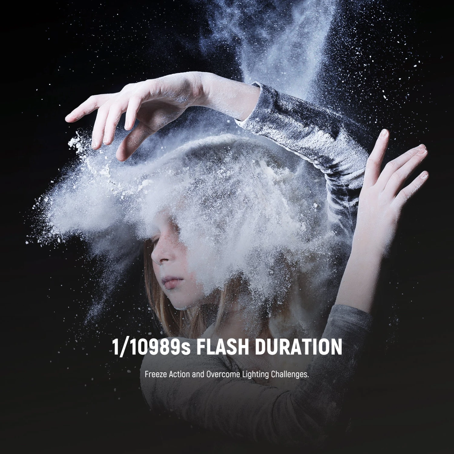 - 21.6V/2800mAh Lithium Battery– Increased battery capacity provides 400 full power flashes, a recycling time of 0.01-1.2s, and a flash duration of 1/209-1/10989s, perfect for capturing continuous action. Battery compartment for easy replacement of spare batteries. With a DC charging port, the flash can be powered via the included adapter and takes about 3.5 hours to fully charge