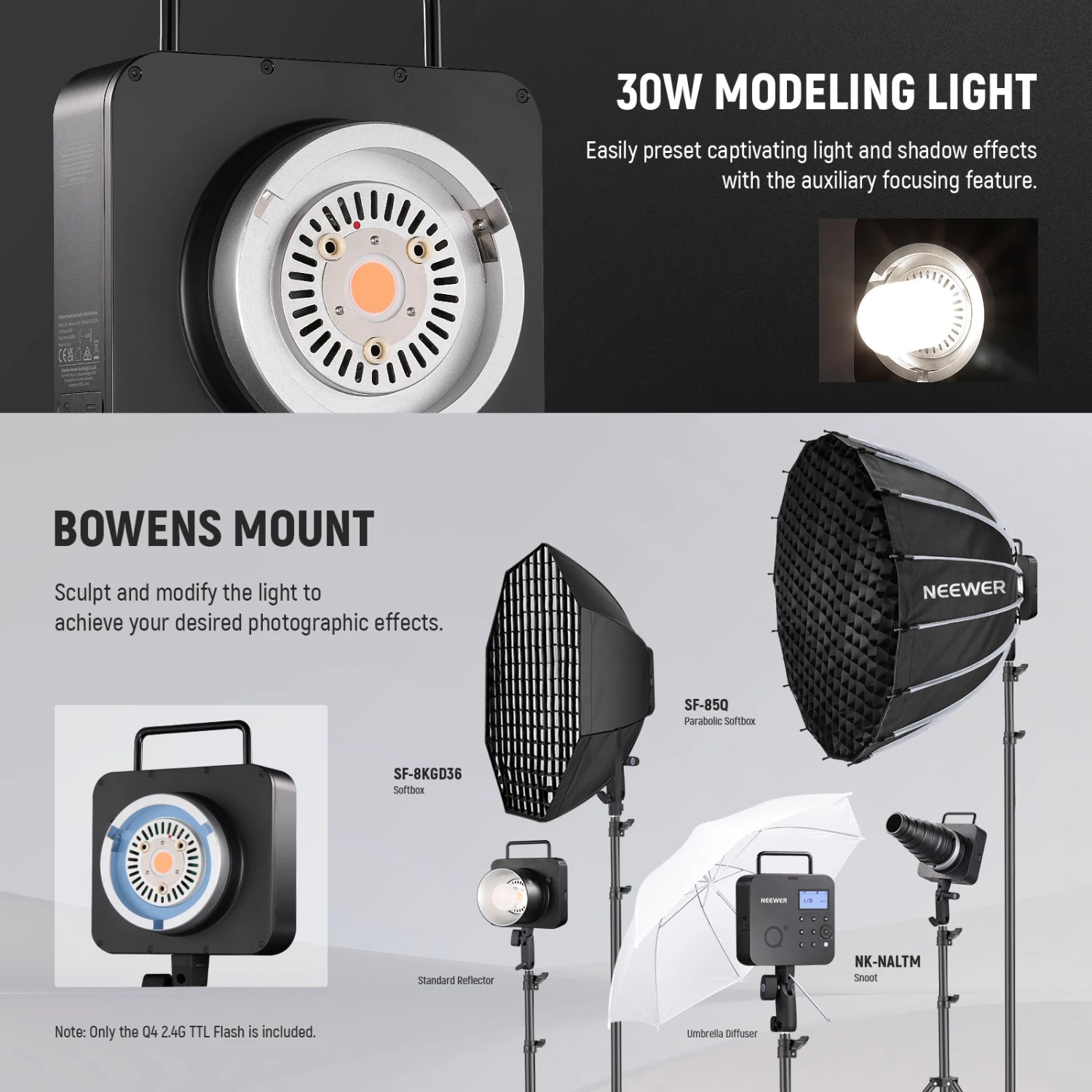 - IF Design Awarded 400Ws Outdoor Flash-Q4 400Ws battery powered strobe light boasts a compact rectangular design, measuring 7.28″x6.06″x8.35″ and weighing just 4.94lb, suitable for both outdoor photography and studio setup. With its impressive GN72 with a high performance reflector (not included), 30W/5600K/CRI95+ LED modeling lamp, and convenient top handle, it caters to various shooting needs. Note: Do not trigger the flash without plugging in the flash tube, as it will damage the equipment.