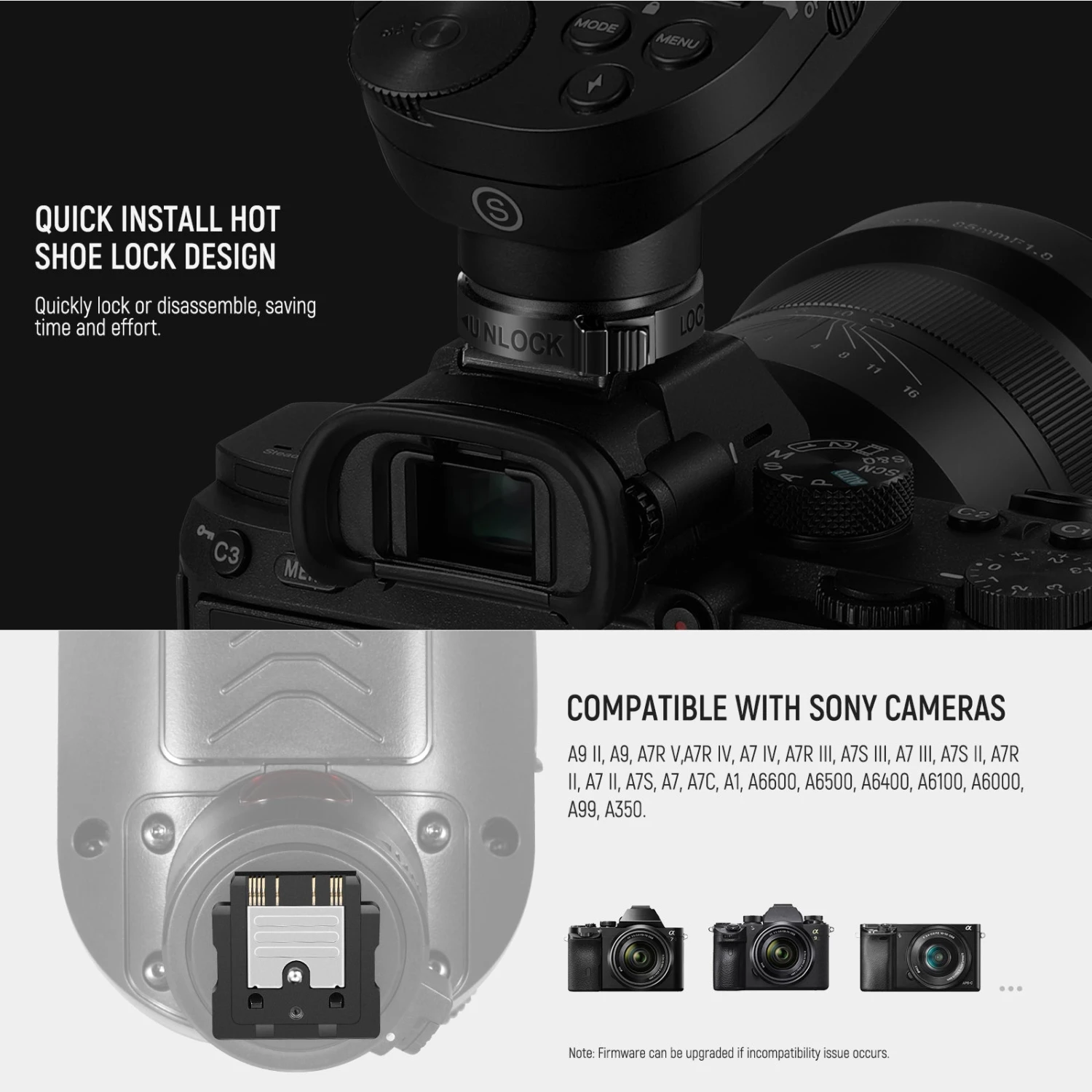 - Wide Compatibility– The QPRO-S flash trigger can be quickly fixed on the camera with the metal hotshoe. Compatible with Sony A9 II A9 A7R V A7R IV A7 IV A7R III A7S III A7 III A7S II A7R II A7 II A7S A7 A7C A1 A6600 A6500 A6400 A6100 A6000 A99 A350. Note: Firmware upgrades are available to address compatibility issues